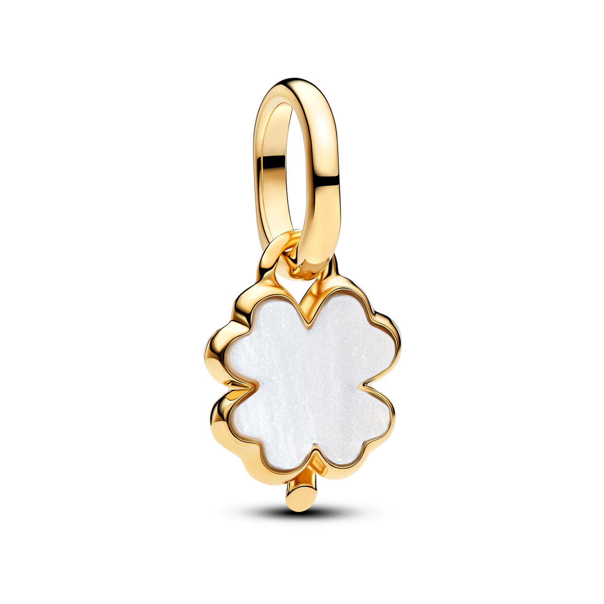 Das 14 Karat vergoldete Kleeblatt-Charm aus weißem, künstlichem Bioharz-Perlmutt verleiht deinem Look einen funkelnden Glücksakzent. Ein bezauberndes Schmuckstück, das das wichtigste Glückssymbol der Natur stilvoll in deine Sammlung integriert.