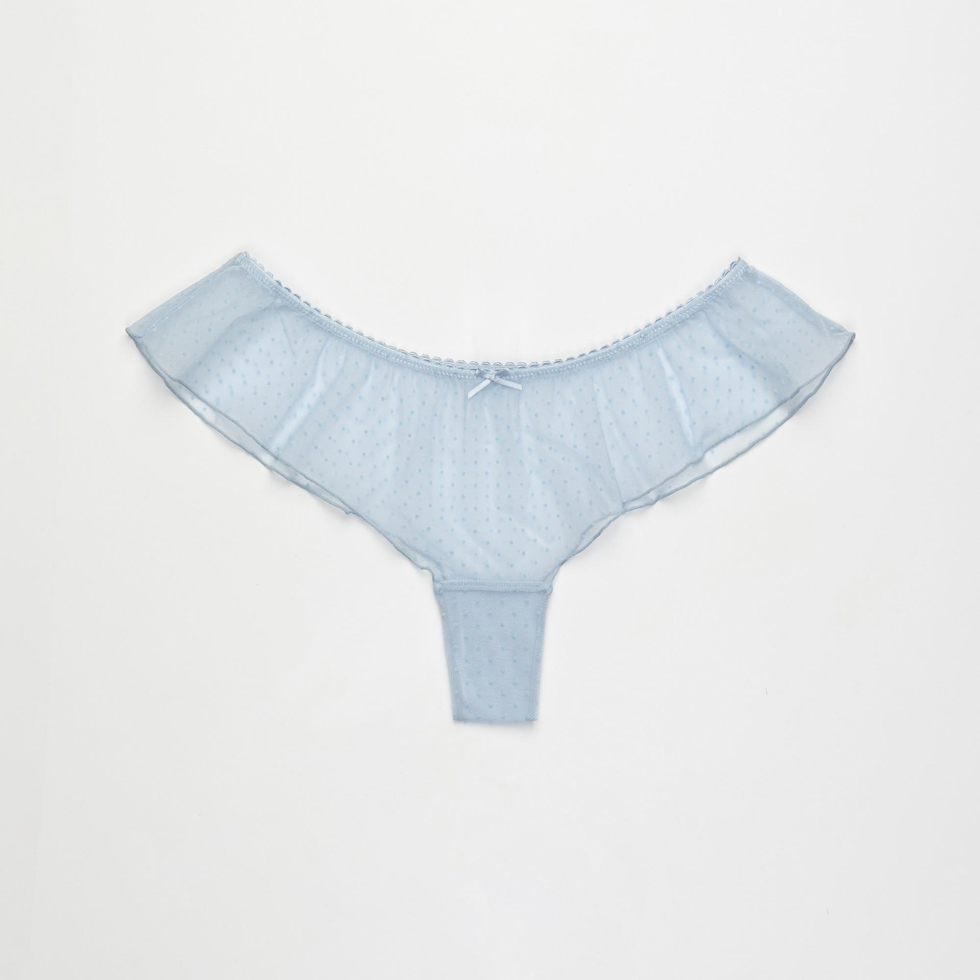 Diese Hipster-Slips verfügen über ein verspieltes Tupfenmuster und zarte Rüschenkanten, die eine charmante und bequeme Ergänzung für jede Dessous-Kollektion bieten. Das Design umfasst eine kleine Schleife vorne, die den femininen Reiz verstärkt.