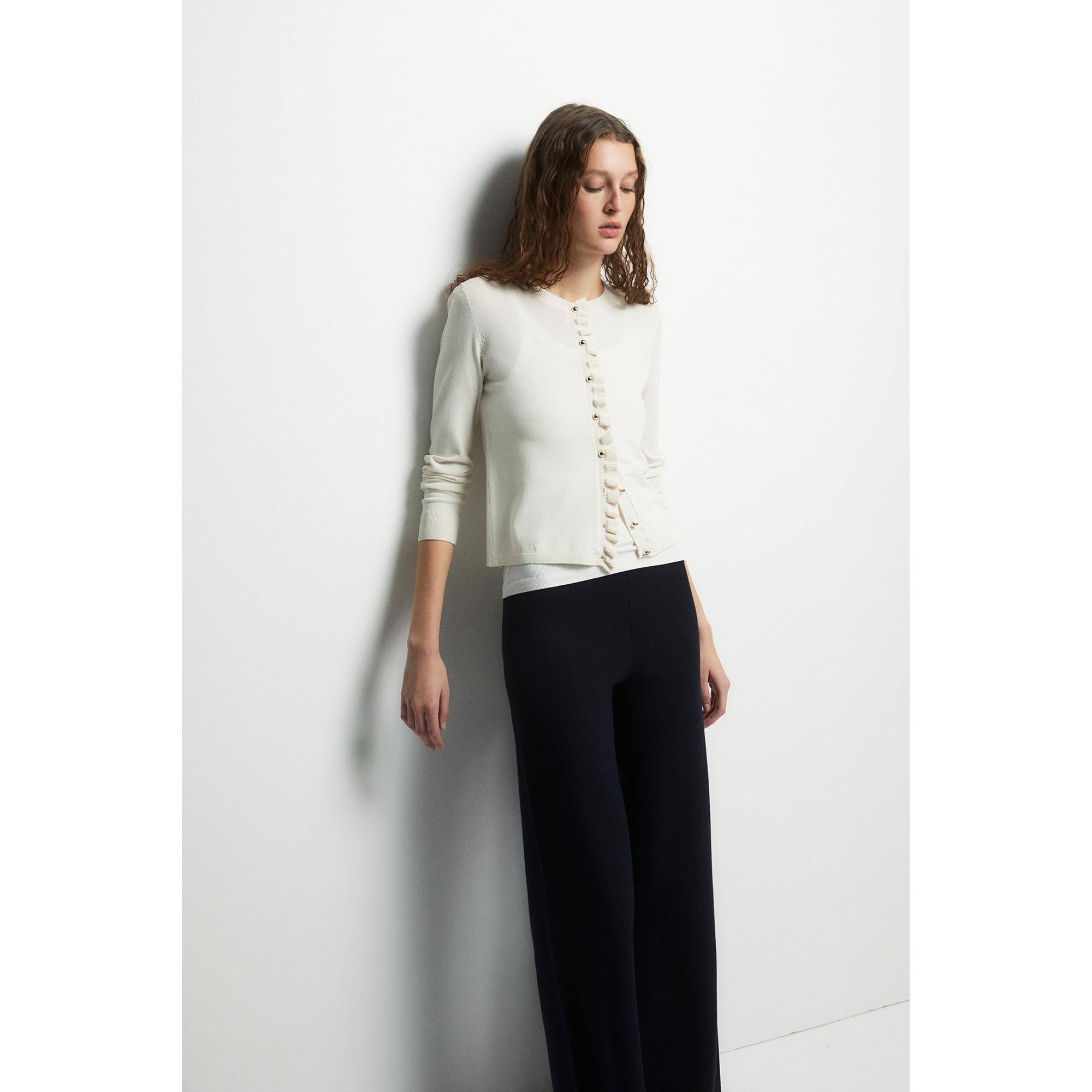 Dieser elegante Cardigan verfügt über einen einzigartigen Rüschenbesatz entlang der Knopfleiste, der jedem Outfit einen Hauch von Raffinesse verleiht. Sein klassisches Design macht ihn zu einem vielseitigen Kleidungsstück für verschiedene Anlässe.
