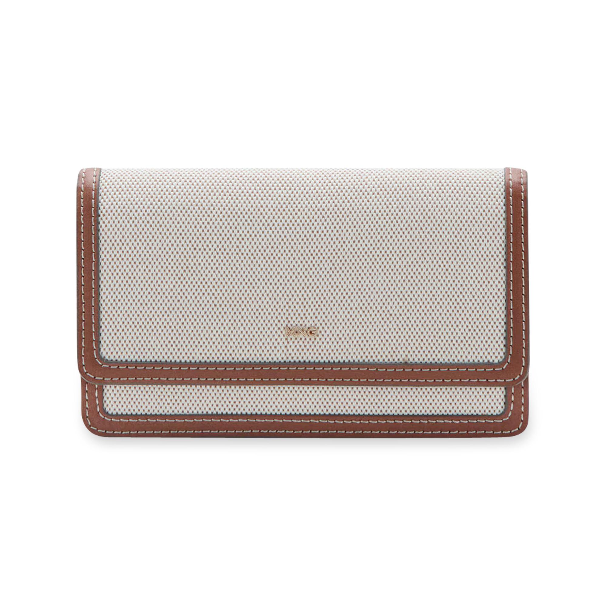 Dieses Portemonnaie bietet eine stilvolle und praktische Lösung zur Organisation von Essentials. Sein Design kombiniert einen strukturierten Stoff mit kontrastierenden Zierleisten und schafft so ein raffiniertes Accessoire, das für verschiedene Anlässe geeignet ist.