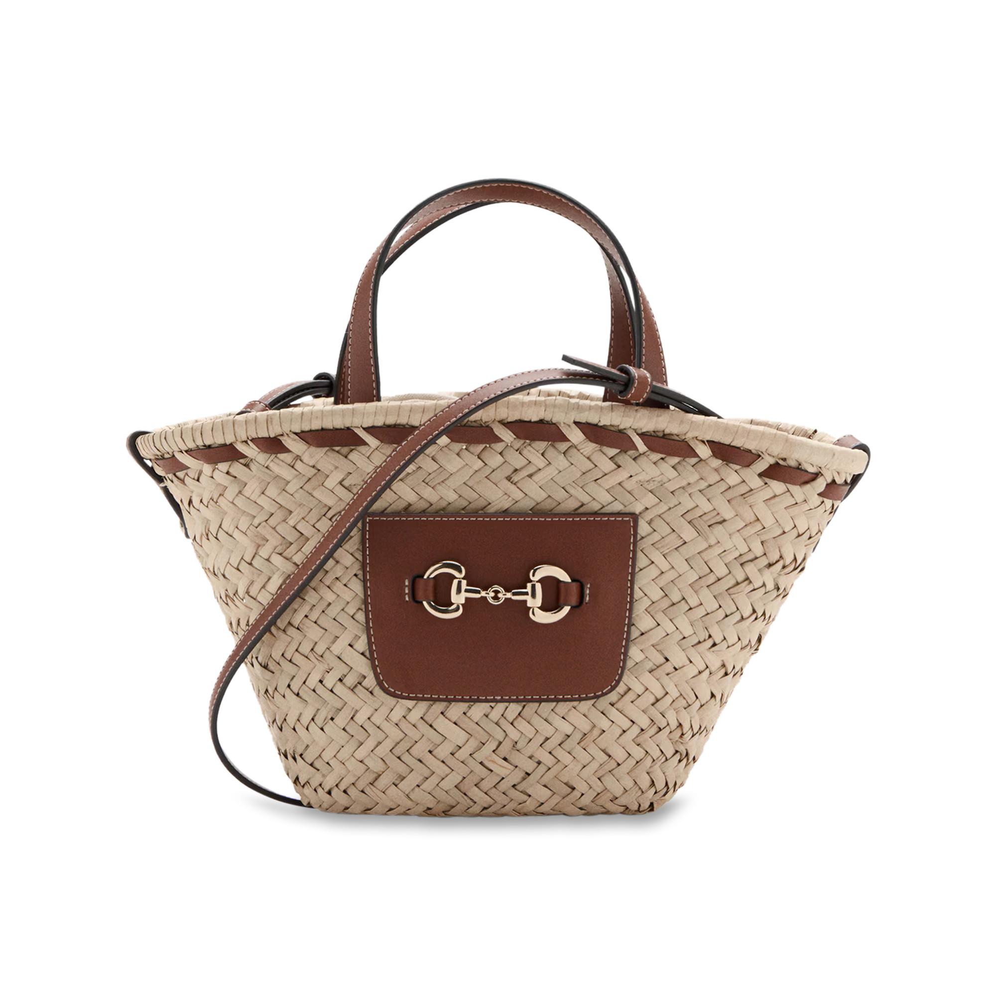 Diese Umhängetasche präsentiert sich in einem geflochtenen Strohdesign, das eine natürliche und stilvolle Ästhetik bietet. Sie ist mit braunen Lederimitat-Details akzentuiert, darunter eine Frontklappe mit dekorativer goldfarbener Horsebit-Hardware, Tragegriffen und einem abnehmbaren Schulterriemen. Die Konstruktion der Tasche vereint lässige Eleganz und praktische Funktionalität und eignet sich für verschiedene Anlässe.