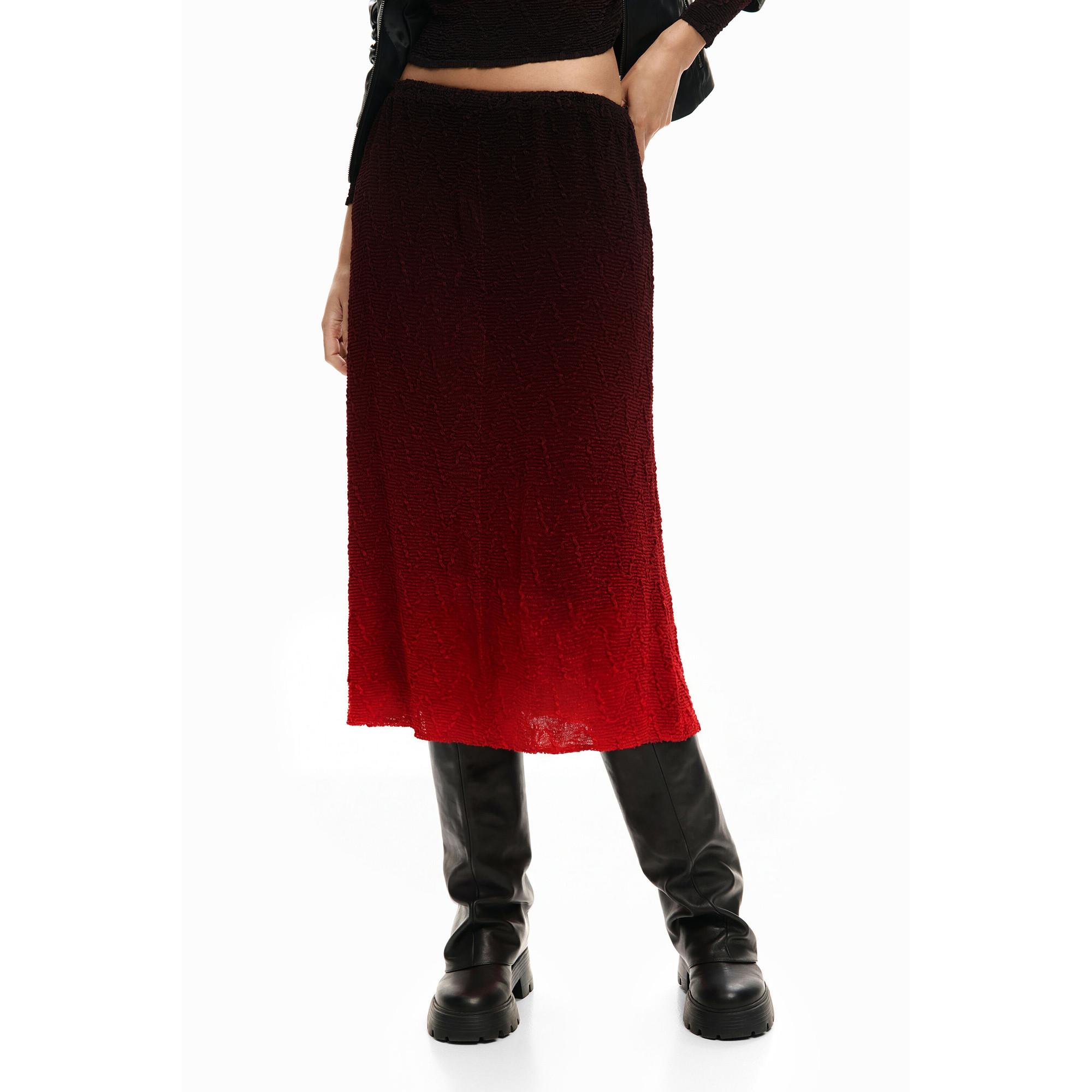 Dieser Midi-Rock präsentiert ein auffälliges Ombre-Design, das von einem tiefen, satten Farbton an der Taille zu einem lebhaften Farbton am Saum übergeht. Der strukturierte Stoff verleiht dem gesamten Look Tiefe und visuelles Interesse. Sein vielseitiges Design macht ihn für verschiedene Anlässe geeignet und bietet eine Mischung aus modernem Stil und Komfort.