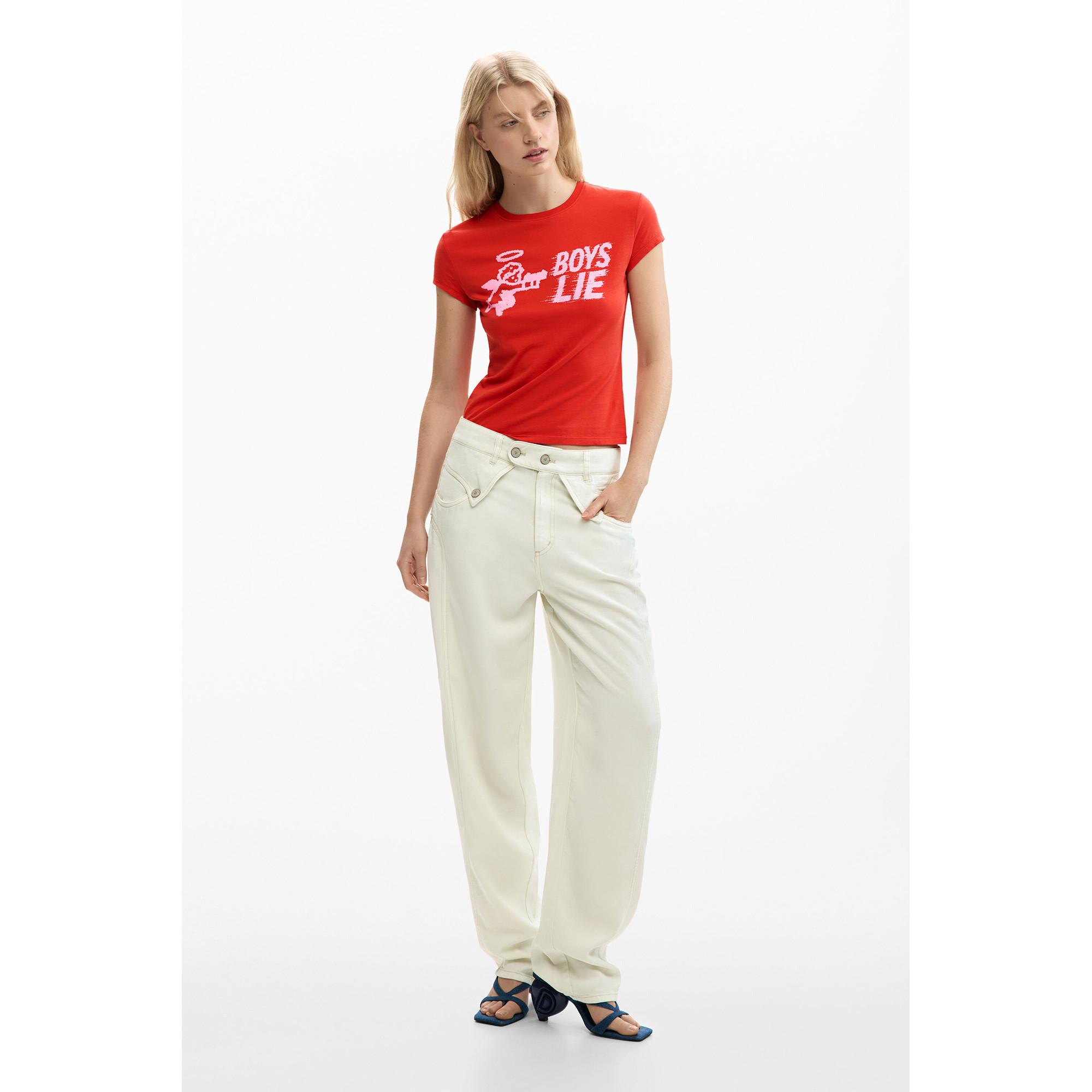 Dieses T-Shirt zeigt einen verspielten Grafikdruck auf der Vorderseite, der eine Amorfigur neben dem Text „BOYS LIE“ darstellt. Die Rückseite des Shirts ist mit einem kleinen Herz-Grafikdruck und Text versehen, der ein subtiles Detail hinzufügt. Dieses T-Shirt ist eine vielseitige Ergänzung für jede Freizeitgarderobe.