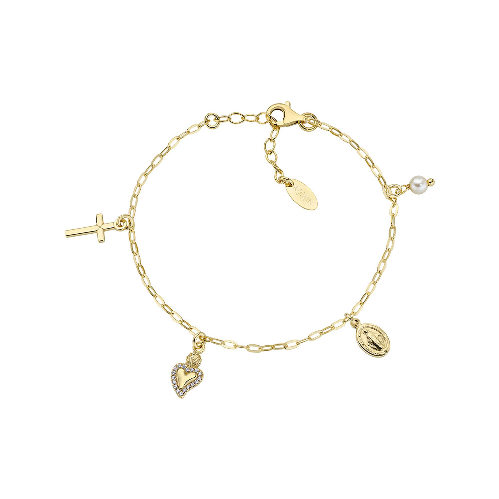 Dieses Damenarmband aus vergoldetem Sterling Silber vereint mehrere symbolträchtige Charms zu einem ausdrucksstarken Schmuckstück. Eine filigrane Kreuzform, ein Sacred-Heart-Anhänger mit weissen Zirkonia, eine Medaille der wundertätigen Madonna sowie eine zarte Perle verleihen dem Design Tiefe und Bedeutung. Dank der verstellbaren Länge von 16 bis 19 cm lässt sich das Armband individuell anpassen und ist ein stilvoller Begleiter für jeden Tag.