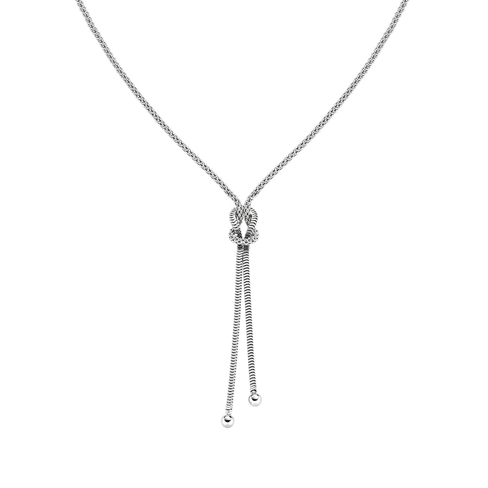 Diese Damenkette aus rhodiniertem Sterling Silber besticht durch ihr modernes Design mit zwei ineinandergreifenden Ketten, die einen eleganten Knoten bilden. Der Love Knot steht symbolisch für ewige Liebe, Zuneigung und den Schutz bedeutungsvoller Verbindungen. Pur getragen wirkt die Kette besonders edel, kombiniert mit dem passenden Armband unterstreicht sie ihre emotionale Aussagekraft. Die verstellbare Länge von 40 bis 45 cm sorgt für optimalen Tragekomfort.