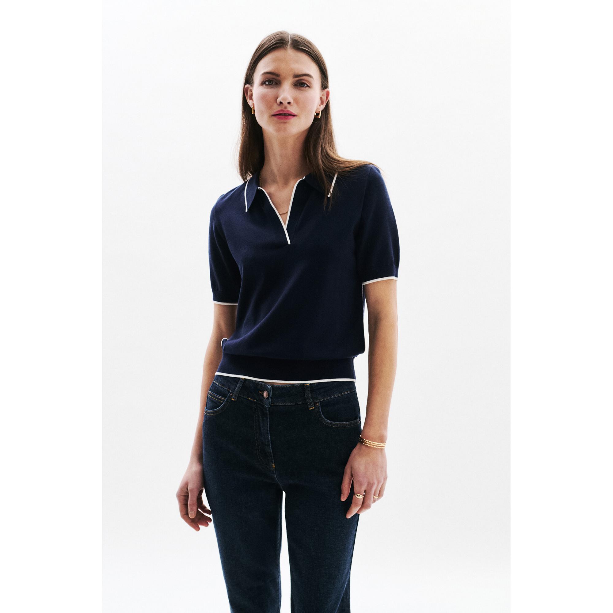 Dieser Kurzarm-Polo-Pullover bietet einen klassischen und dennoch modernen Look. Er verfügt über einen V-Ausschnitt mit Kragen, der eine raffinierte Note verleiht. Das Design umfasst kontrastierende weisse Zierleisten entlang des Kragens, der Knopfleiste, der Ärmel und des Saums, die dem dunkelblauen Stoff ein stilvolles Detail hinzufügen. Die gerippten Bündchen und der Saum sorgen für einen bequemen und sicheren Sitz.