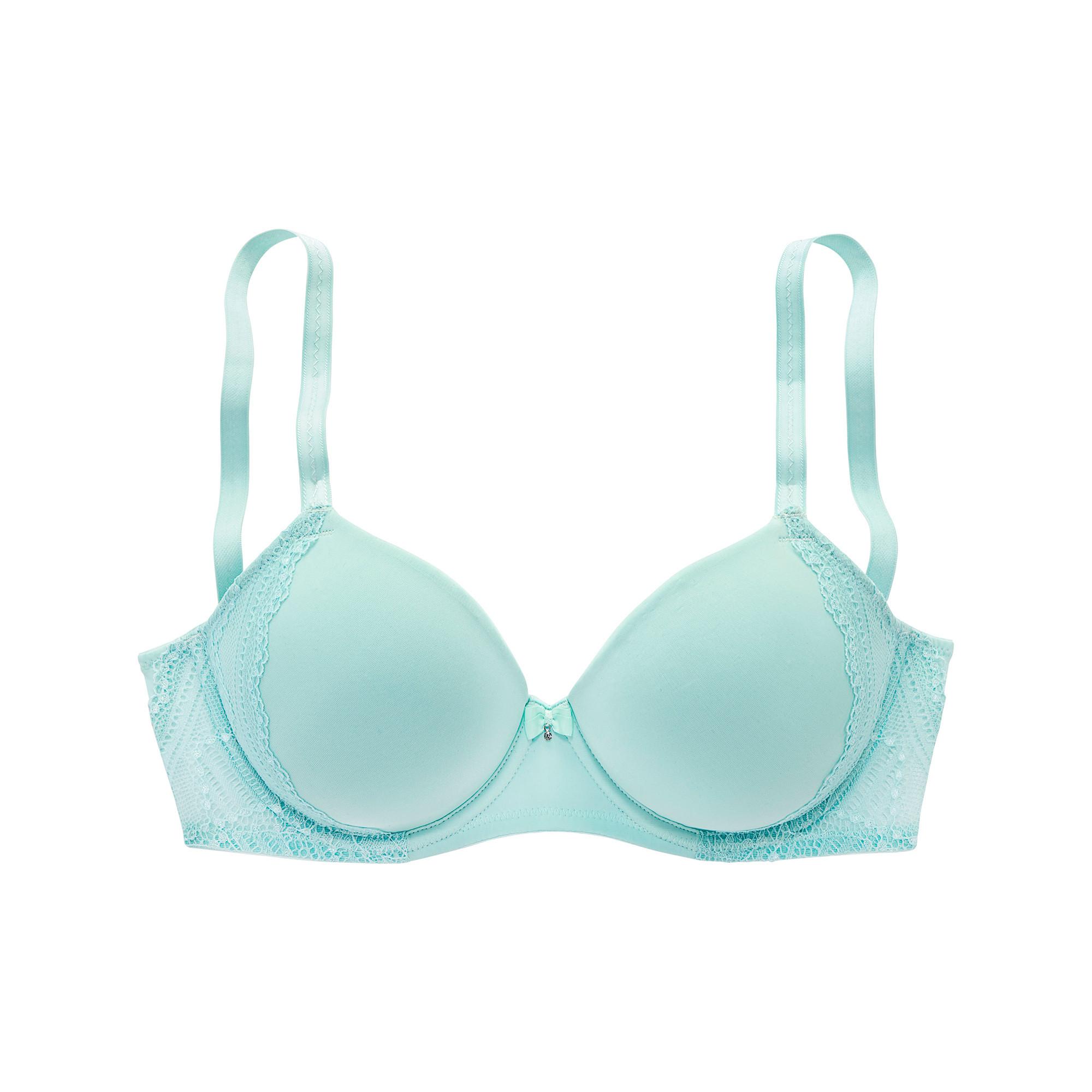 Dieser wattierte Bügel-BH bietet bequemen Halt und eine schmeichelhafte Silhouette. Die glatten Cups sind an den Rändern und Seiten mit zarten Spitzendetails verziert, die einen Hauch von Eleganz verleihen. Eine kleine Schleife mit einem dekorativen Anhänger sitzt in der vorderen Mitte und unterstreicht das charmante Design.