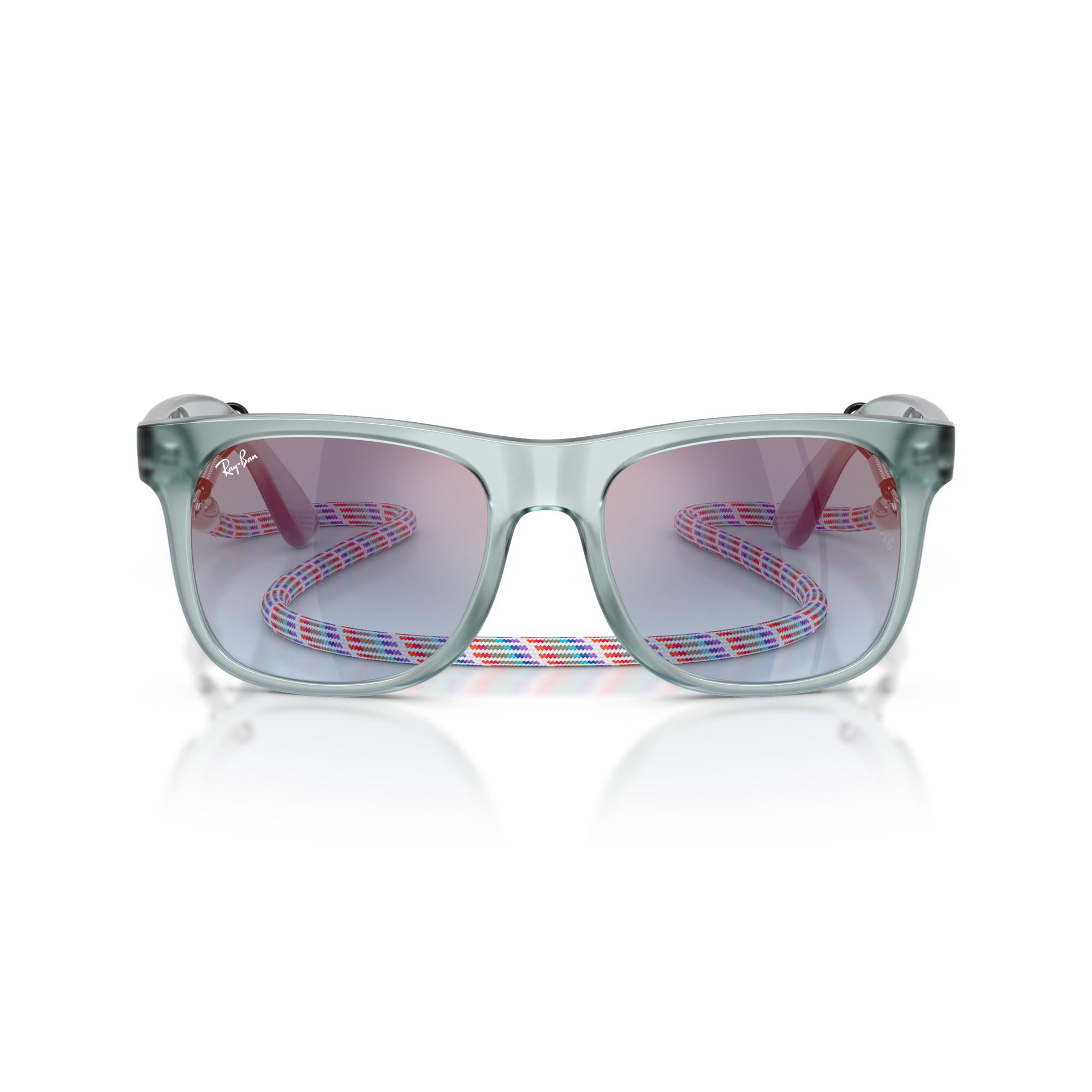 Diese quadratische Sonnenbrille zeichnet sich durch ein modernes Design mit einem hellblauen transparenten Rahmen und Verlaufsgläsern aus. Das integrierte Band mit seinem farbenfrohen geflochtenen Muster sorgt dafür, dass die Sonnenbrille sicher an ihrem Platz bleibt, was sie ideal für einen aktiven Lebensstil macht. Das Ray-Ban Logo ist dezent an den Bügeln angebracht und verleiht einen Hauch von klassischem Stil.