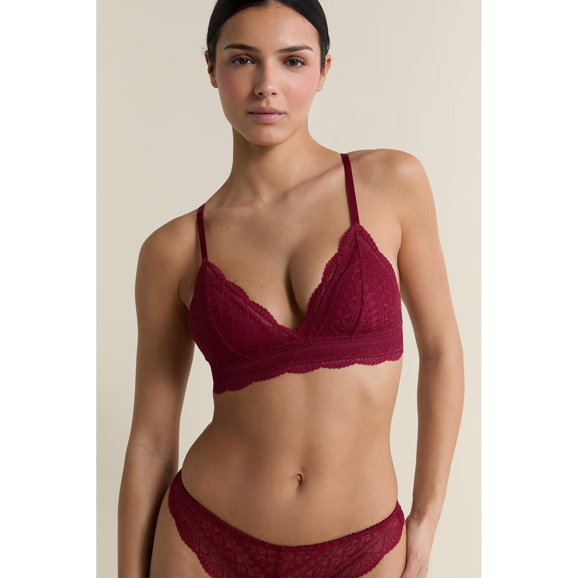 Dieser Triangel-BH kombiniert feminine Spitze und Stretch-Mikrofaser für ein angenehmes Tragegefühl. Er bietet einen tiefen V-Ausschnitt, ist ohne Körbchen und Bügel konstruiert und sorgt dank einem elastischen Unterbrustband für natürlichen Halt. Für Körbchengrössen D und grösser sind die Träger breiter und der Rücken höher geschnitten.