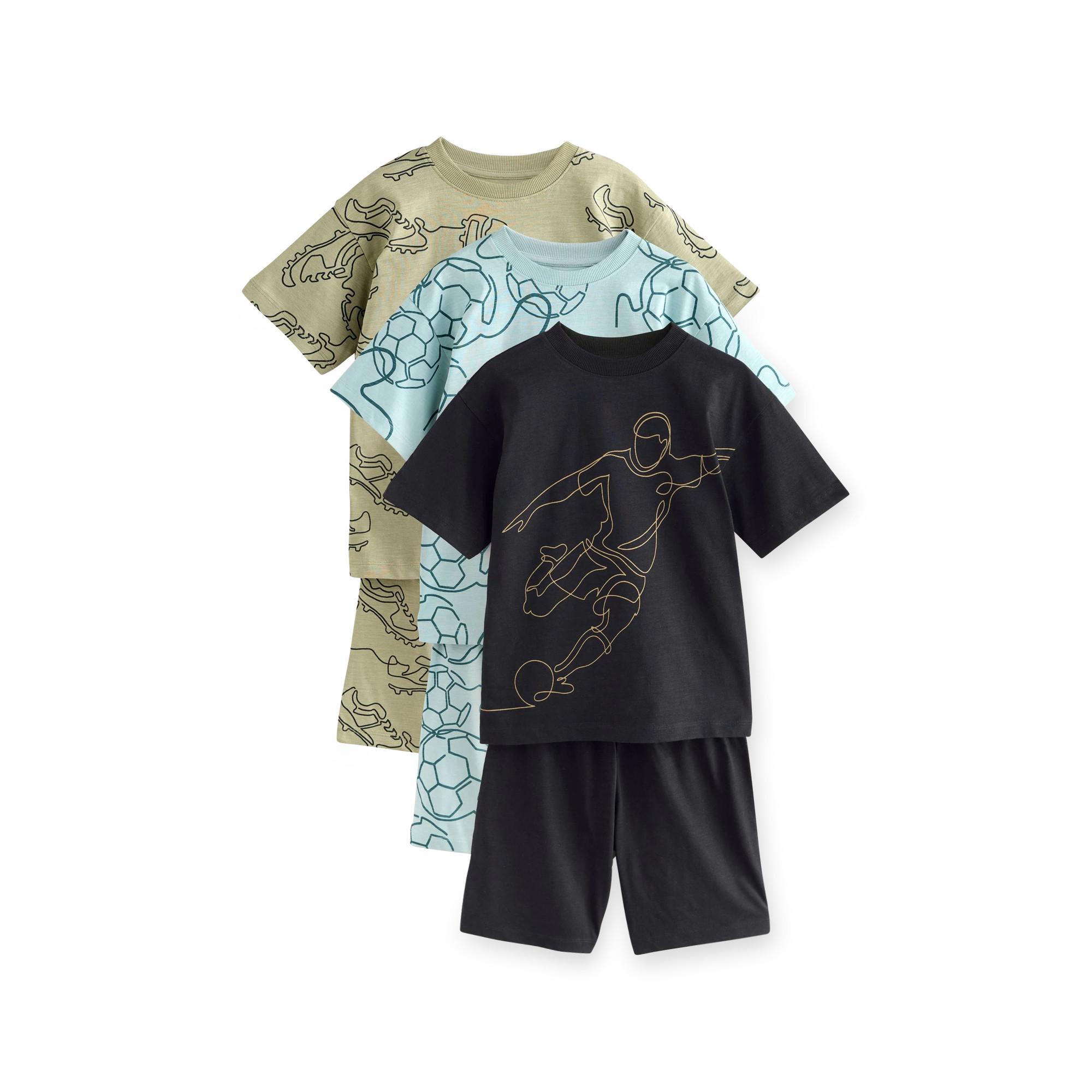 Die kurzen Pyjamas von Football im praktischen 3er-Pack in Blau, Schwarz und Grün bieten angenehmen Tragekomfort und sind ideal für warme Nächte. Dank 100 % Baumwolle und waschmaschinenfester Qualität sind sie besonders pflegeleicht und hautfreundlich.