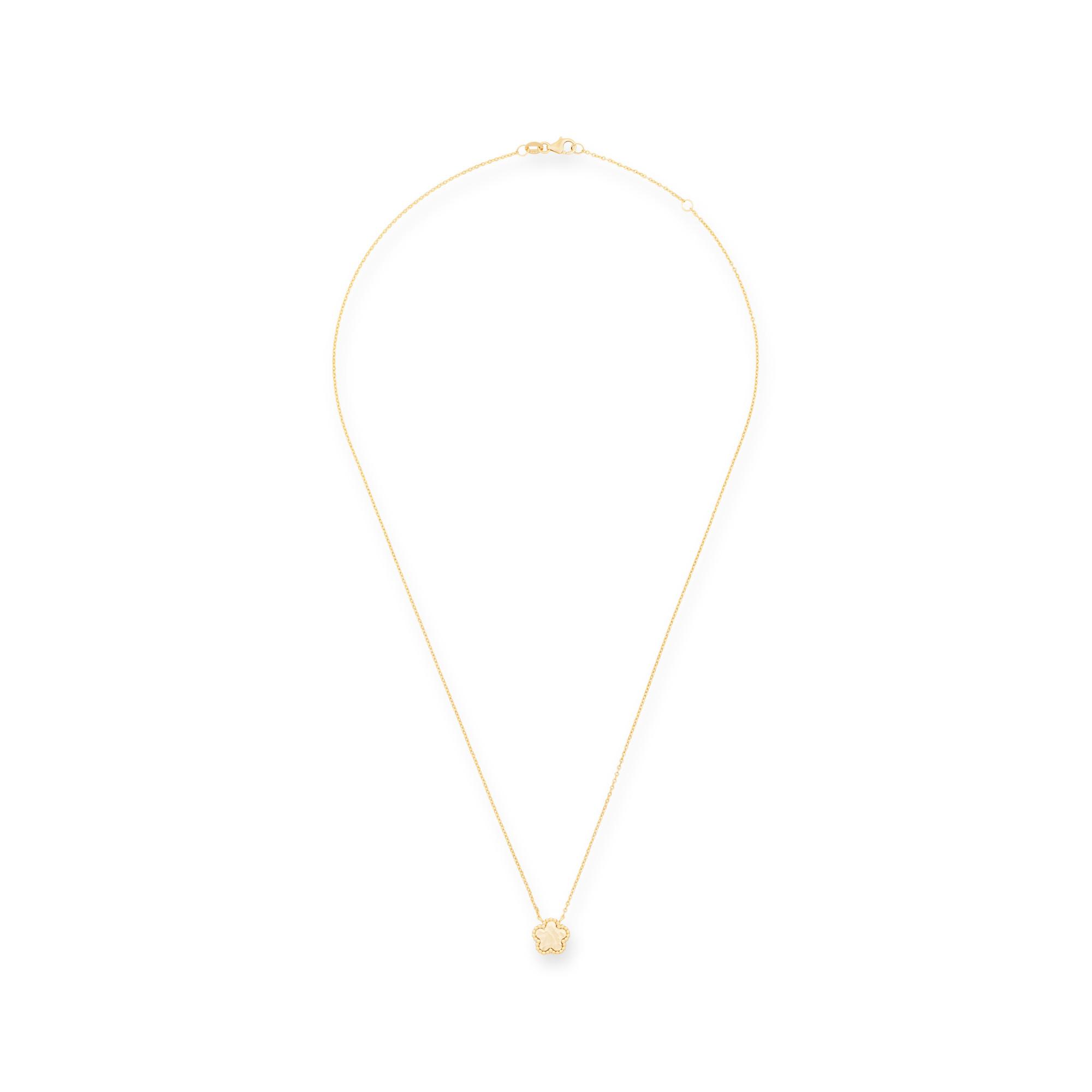 Diese Halskette von Collection N° 9 ist ein zartes Schmuckstück, hergestellt aus 9-karätigem Gelbgold. Die Gliederkette trägt einen blütenförmigen Anhänger mit Struktur-Design. Sie ist in der Weite anpassbar und schliesst sicher per Karabinerverschluss.