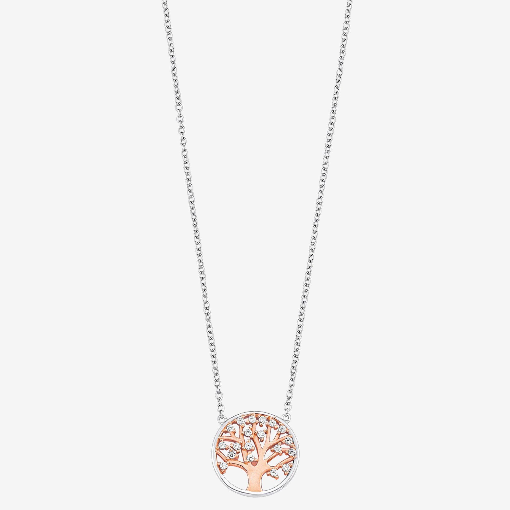 Die kraftvolle Kette von amor sticht mit den weissen Zirkonia-Blättern dezent hervor. Der Baum ist rosévergoldet und bezaubert mit dem modernen Bicolor-Look. Der Lebensbaum symbolisiert Wachstum und Entwicklung, Fruchtbarkeit, Unsterblichkeit und Heilung.