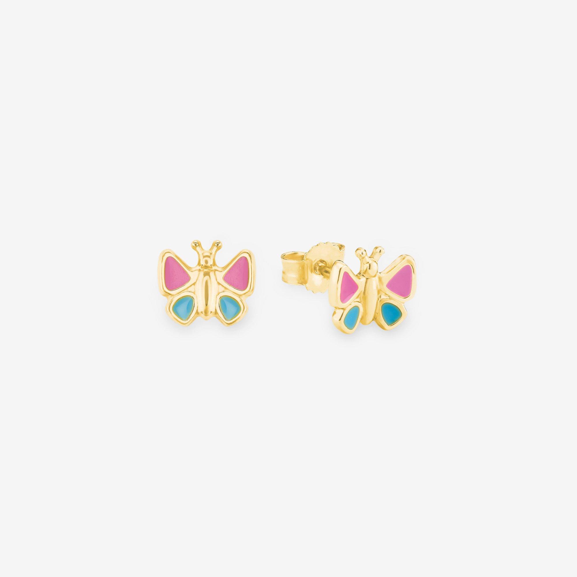 Diese schönen Schmetterling-Ohrringe bestehen aus glänzendem 375er Gelbgold und einer farbigen Emaillierung. Der Kinderohrschmuck ist ca. 6mm x 7mm groß und lässt sich praktisch mit einem Ohrstecker schliessen. Überraschen Sie Ihre Kleine mit diesem süssen Kinderschmuck und lassen Sie Kinderaugen strahlen.