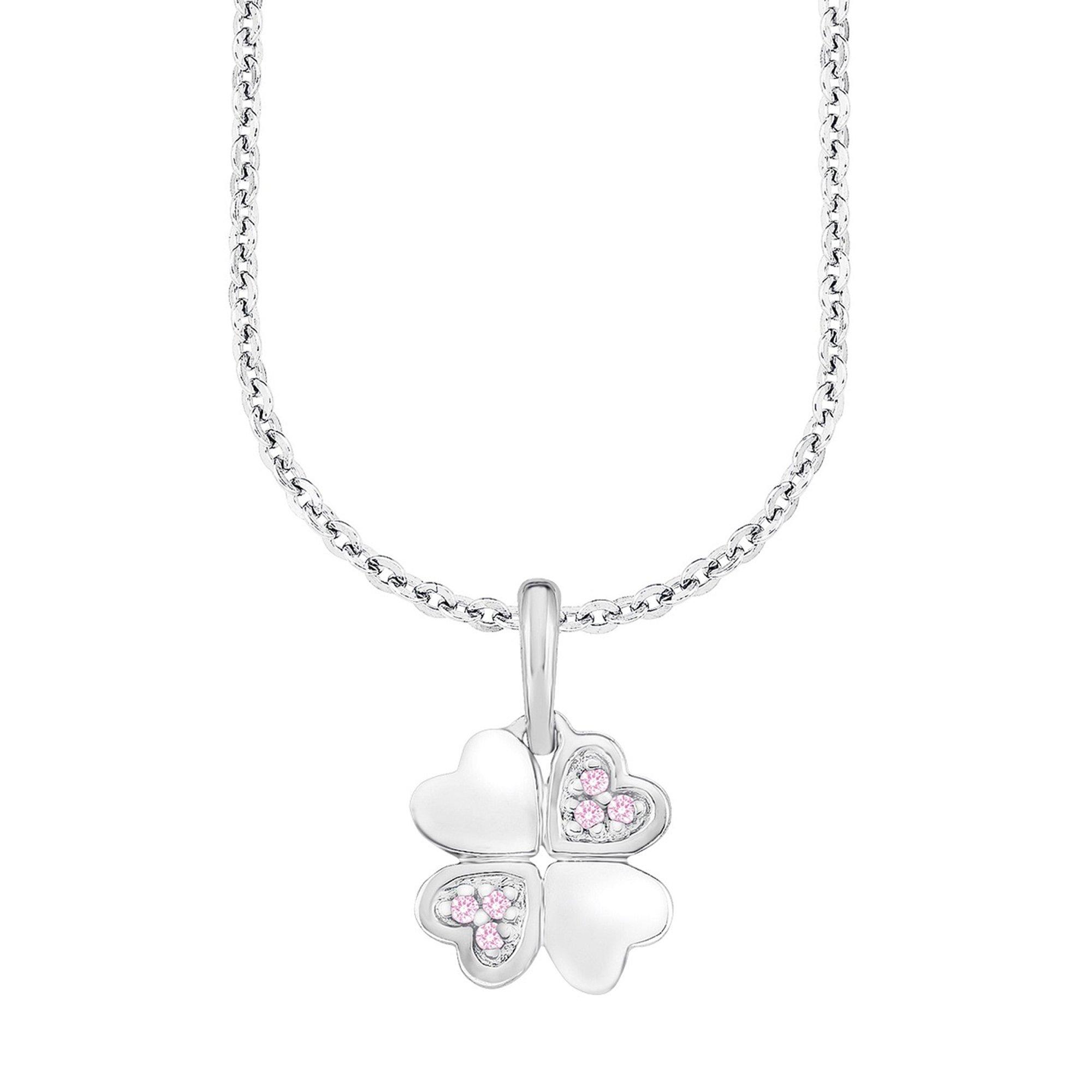 Das Set von Amor besteht aus einer Anker-Kette und Anhänger. Der Anhänger zeigt vier Herzen, die wie die Blätter eines Kleeblatts angeordnet sind. Zwei sind mit Schmucksteinen bestückt.