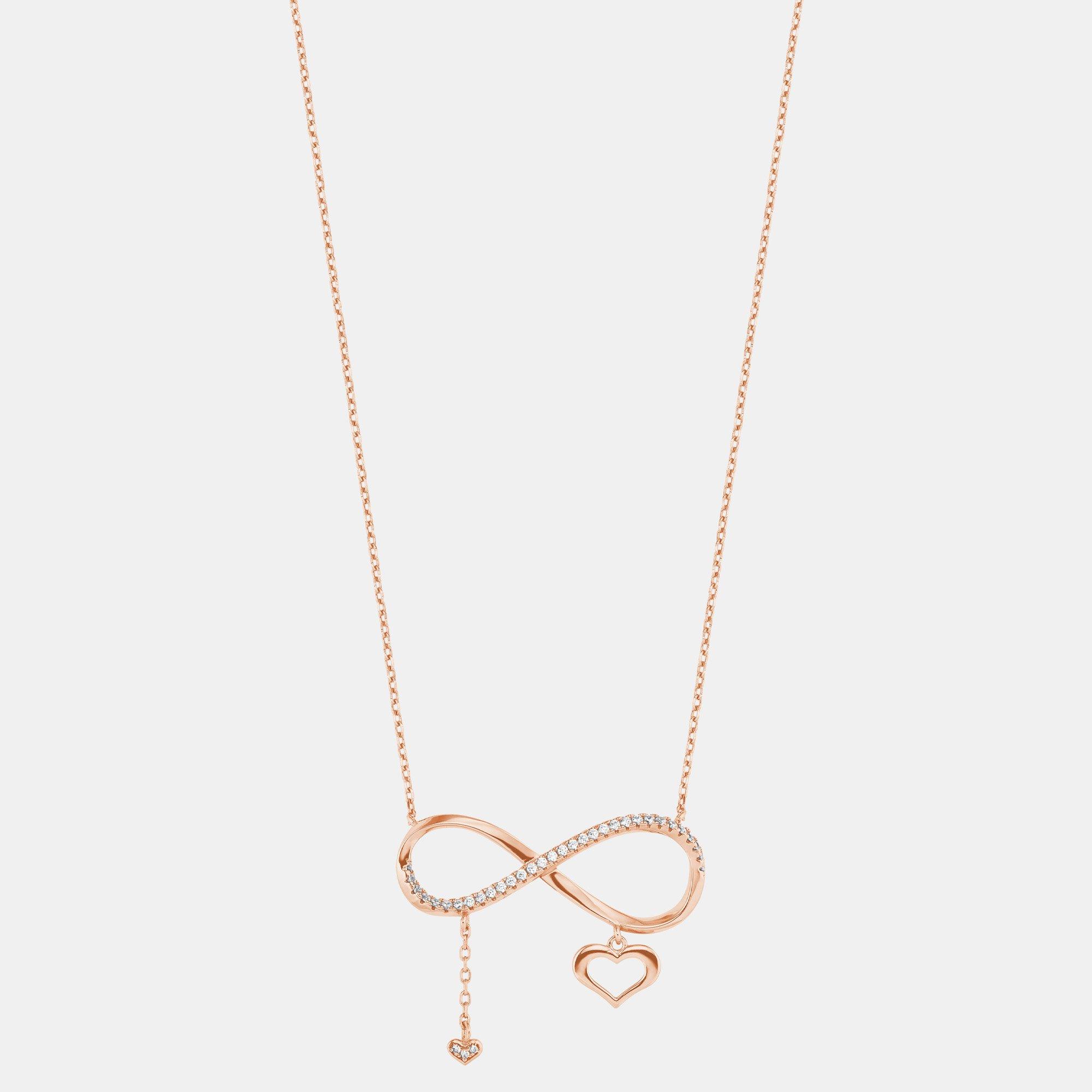 Die auffällige, rosevergoldete Halskette von amor setzt mit dem Infinitysymbol und den Herzen traumhafte Akzente bei jedem Outfit. Zauberhafte, weisse Zirkonia funkeln beim Unendlichkeits-Symbol und beim kleinen Herzanhänger.