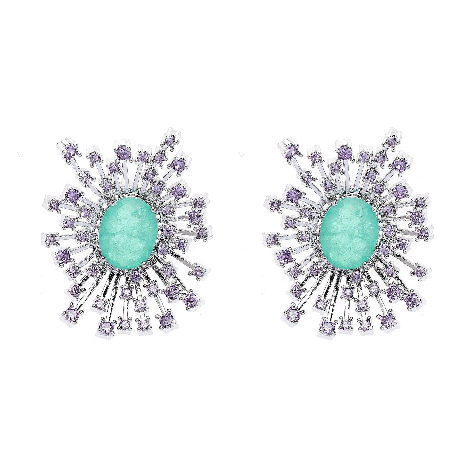 Diese exquisiten Ohrringe bestechen durch einen strahlend hellgrünen, ovalen Edelstein im Zentrum, der von einem funkelnden Meer aus silbernen und violetten Steinen umgeben ist. Ihr filigranes, sternförmiges Design strahlt Eleganz und Raffinesse aus und macht sie zum perfekten Schmuckstück für jeden besonderen Anlass. Größe: 2,7 cm x 2,2 cm | Beschichtung: Rhodiumplattiert | Verschluss: Stecker und Rückseite