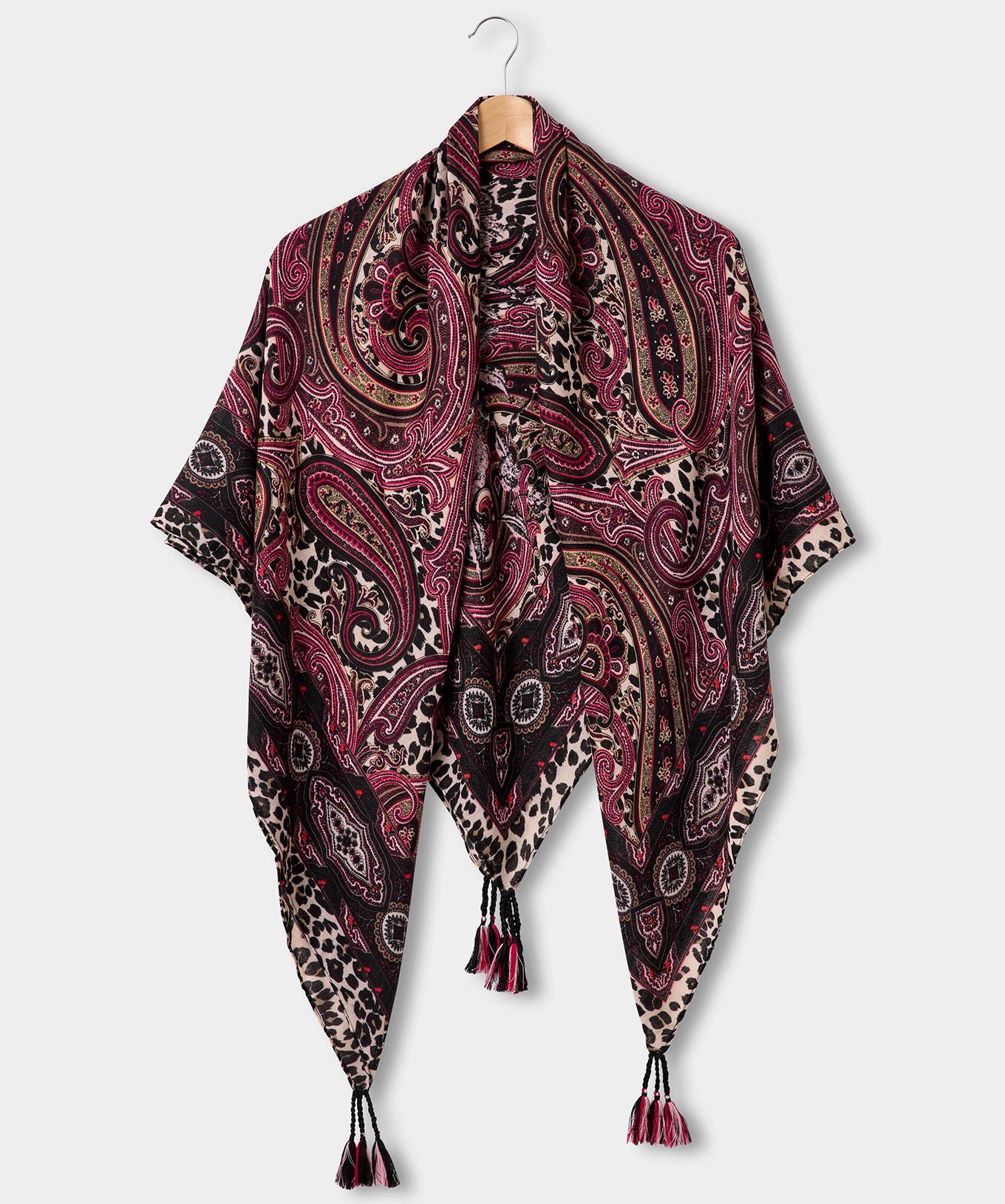Dieser Lagen-Schal präsentiert ein aufwendiges Paisleymuster und bietet ein unverwechselbares und stilvolles Accessoire. Das Design wird durch dekorative Fransen ergänzt, die dem Gesamtbild eine verspielte Note verleihen.