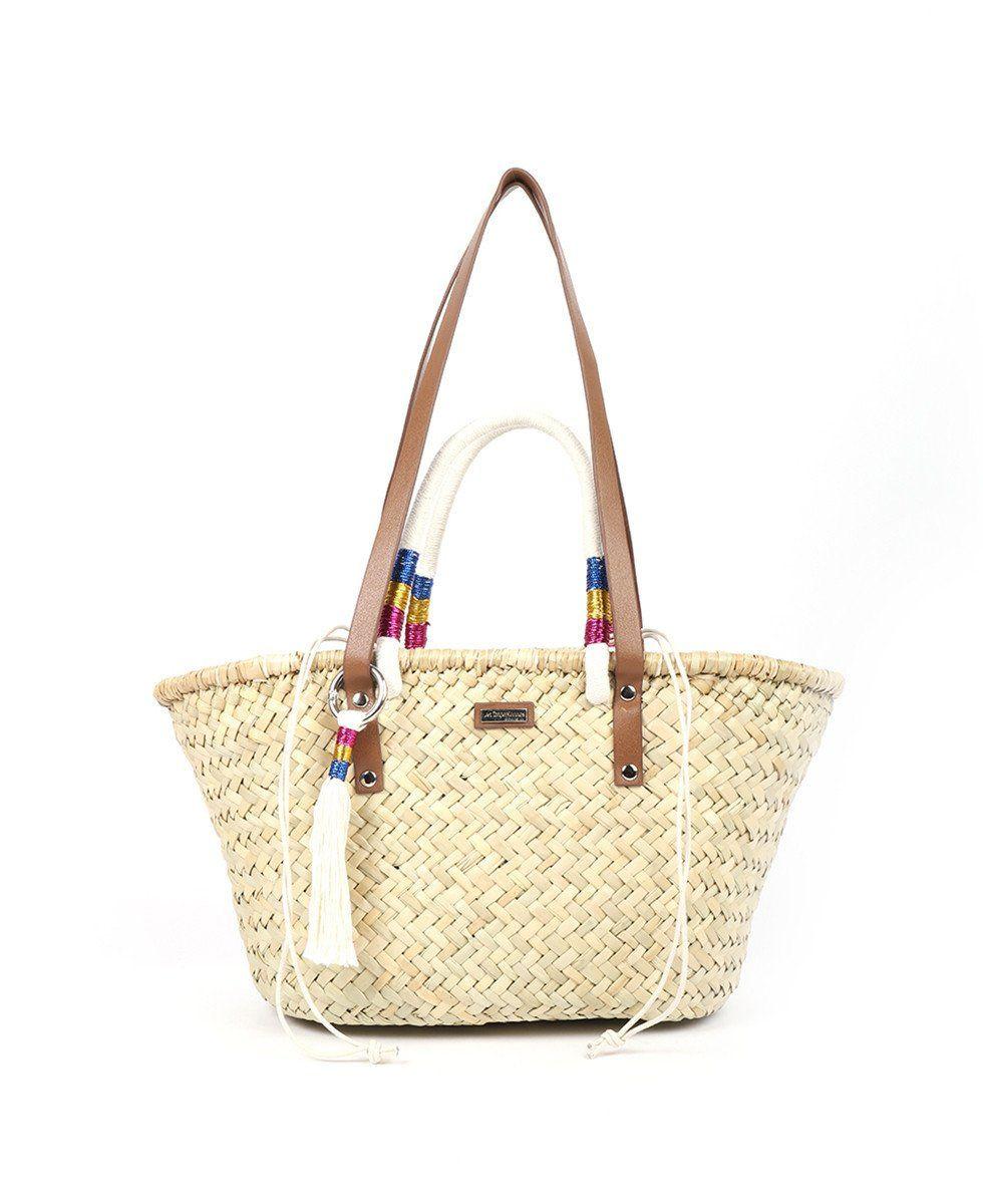 Die Amorgos Tasche ist mit zwei braunen Ledergriffen an der Oberseite sowie weissen Seilgriffen für den Einsatz an der Schulter oder von Hand ausgestattet. Die Seiten der Tasche sind mit bunten blauen, rosa, gelben und lila Quasten geschmückt und verleihen dieser Strohtasche einen Hauch von Fantasie.
