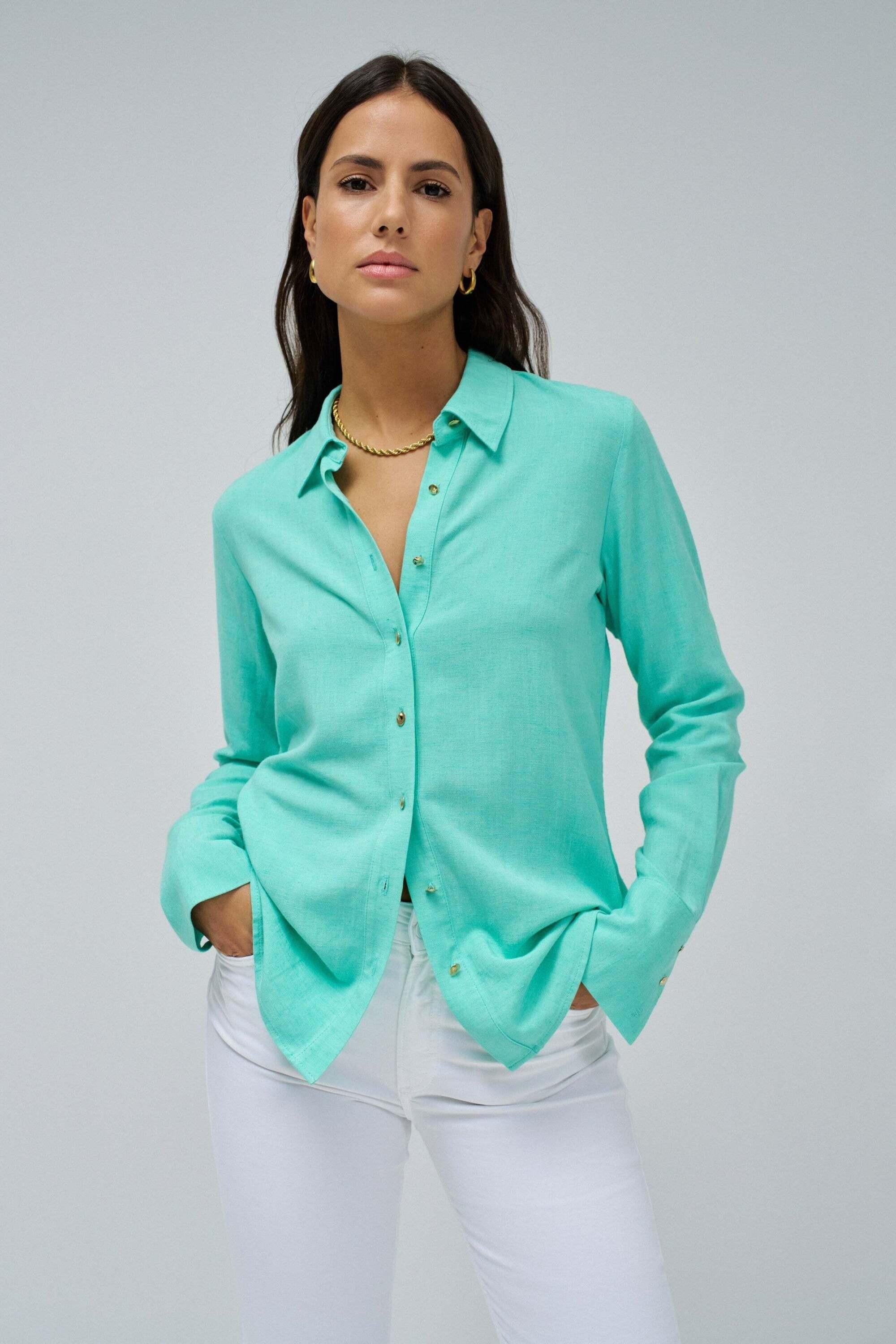 Das Leinenhemd in Hellgrün ist eine klassische Langarmbluse aus leichtem Leinen, die durch ihre durchgehende Knopfleiste und den eleganten Kentkragen besticht. Der Regular Fit sorgt für eine bequeme Passform, die sowohl im Büro als auch in der Freizeit eine gute Figur macht.