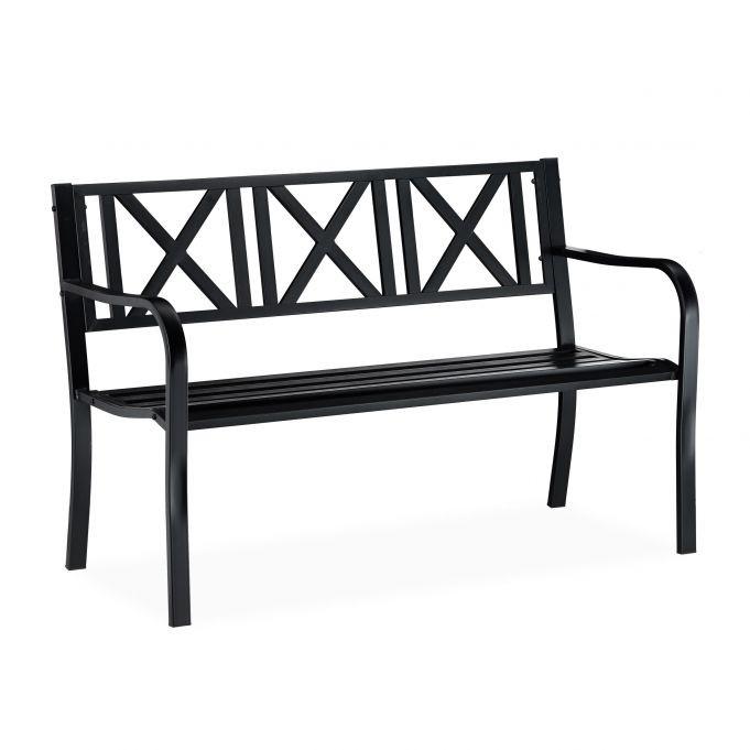 Verschönern Sie Ihren Außenbereich mit einer schwarzen Gartenbank – perfekt für zwei Personen – und genießen Sie Komfort und Stil in Ihrem Garten oder auf Ihrem Balkon.