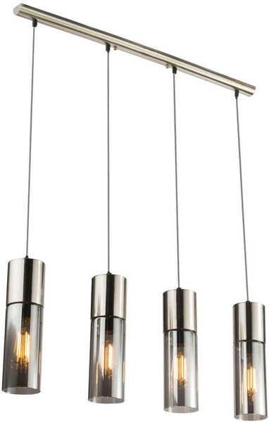 Die nickelmatte Hängeleuchte Annika, überzeugt durch Schlichtheit und Eleganz. Die vier zylinderförmigen Leuchtkörper, passen ausgezeichnet in modern eingerichteten Wohnräumen. Die Schirme sind aus verdunkelten Glas, wenn man die Lampe einschaltet, sieht man die Leuchtmittel ganz zart hindurch scheinen. Diese Leuchtschirme hängen an einer 80cm langen Metallstange. Vor allem als Leuchte über einem Tresen oder Esstisch ist dieses Modell ein echter Hingucker und eine zeitgemässe Lichtquelle. Dank der E27-Fassungen können Sie das Leuchtmittel, sowie die Lichtfarbe und Lichtstärke selbst bestimmen. Wir empfehlen Ihnen LED-Lampen, wegen ihrer Langlebigkeit und Energieersparnis. Sie können die Leuchte sehr gut mit anderen Produkten der gleichen Serie kombinieren.