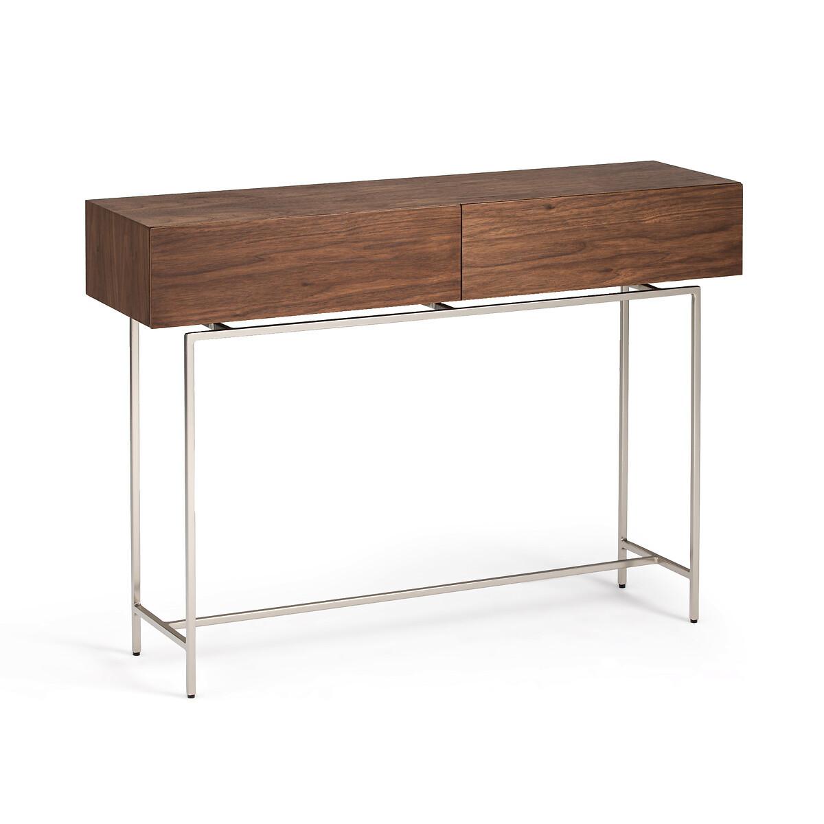 Zeitloses luftiges Design, Nussbaumfurnier, Gestell in Nickel satiniert... Die Konsole Oreko hat einen Schubladenteil, der auf dem filigranen Gestell zu schweben scheint. Design by AM.PM.
