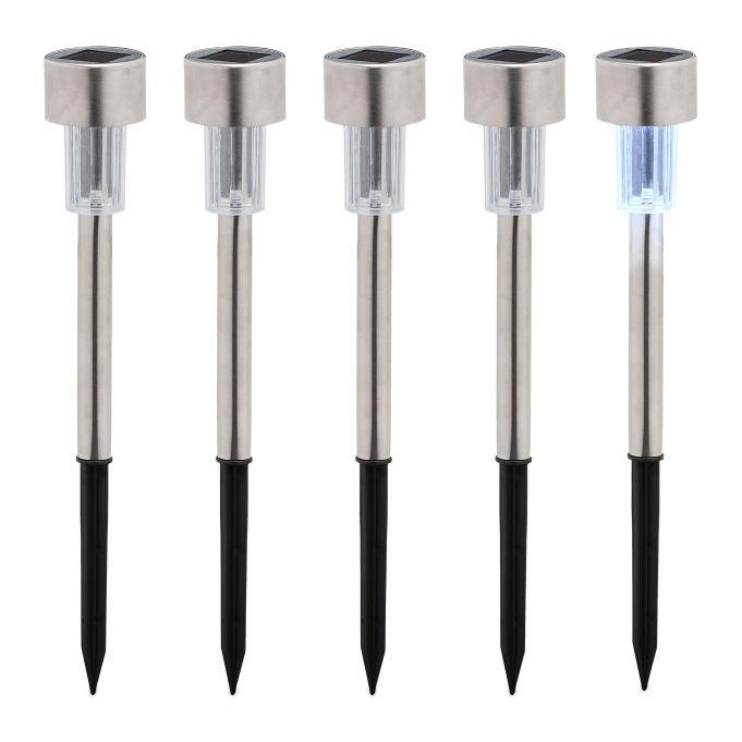 Verschönern Sie Ihren Garten mit silberfarbenen LED-Solarleuchten. Sie sorgen für stimmungsvolle Beleuchtung und vielseitige Platzierungsmöglichkeiten. Die Leuchten laden sich tagsüber auf und leuchten in der Dämmerung für eine entspannte Atmosphäre.