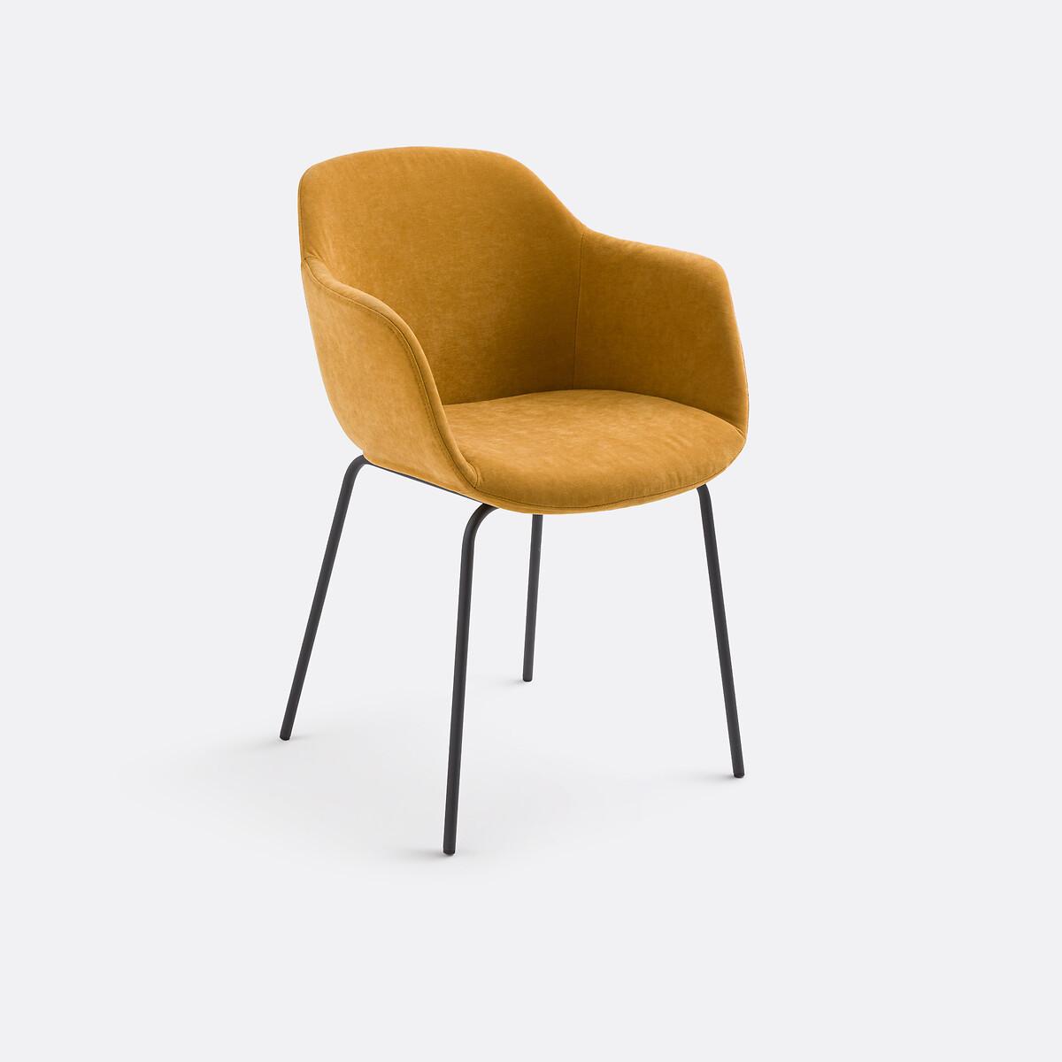 Umhüllende und einladende Form, schlankes und minimalistisches Gestell, Bezug aus strukturiertem Stoff. Das ist Halva, der Esszimmerstuhl im Vintage-Stil. Nehmen Sie Platz, gleich gibt es Essen.
