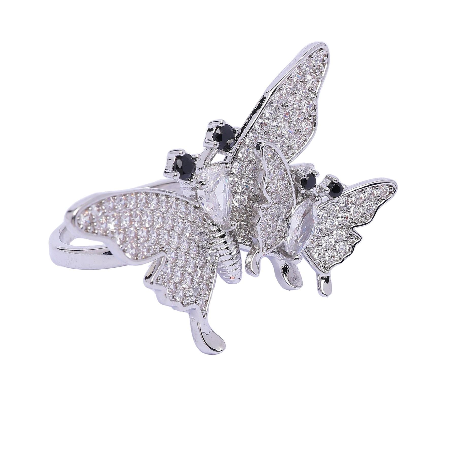 Ein verspieltes Kunstwerk! Ein zarter Schmetterling, besetzt mit funkelnden Steinen, scheint an Ihrem Finger zu schweben. Ein bezauberndes Meisterwerk, ein einzigartiges und bezauberndes Accessoire, das Ihnen ein Lächeln ins Gesicht zaubern wird. Dieser Ring ist ein Statement-Piece, das Eleganz und Verspieltheit ausstrahlt und jedem Outfit einen Hauch von Magie verleiht. Größe: 2,2 cm x 3,5 cm | Beschichtung: Rhodium-plattiert | Verschluss: Zum Überziehen