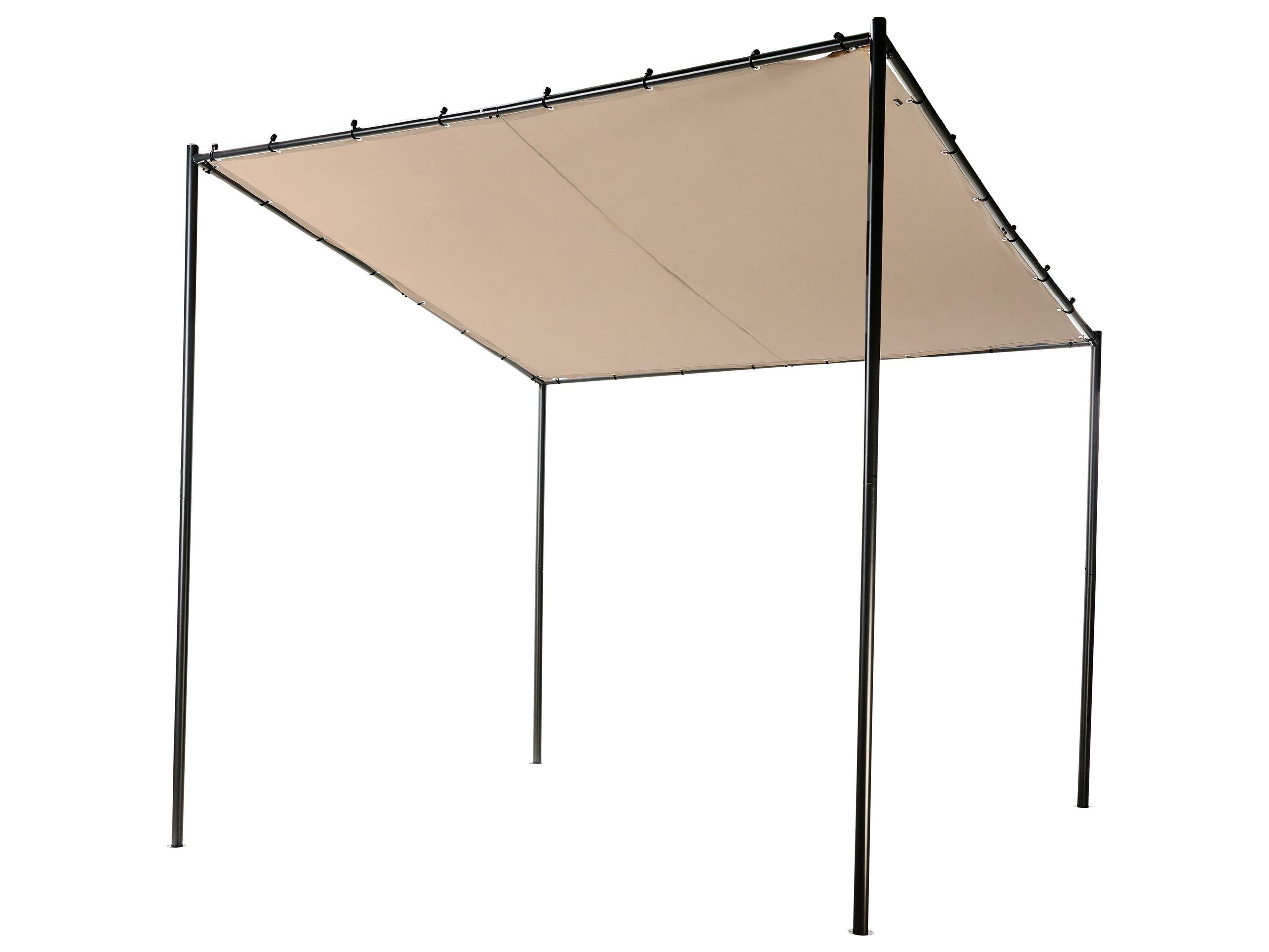 Moderner Gartenpavillon aus taupefarbenem Stoff mit schwarzem Stahlrahmen. Bringen Sie diese moderne Pergola in Ihren Aussenbereich und verwandeln Sie ihn in eine Gartenoase, die sich perfekt für Treffen mit Freunden und Familie eignet. Das schlanke Design in Kombination mit dem hochwertigen pulverbeschichteten Stahlrahmen gewährleistet Stabilität, während der helle Farbton zu vielen zeitgenössischen Stilen passt. Dank seiner Grösse bietet der Pavillon ausreichend Schatten und Schutz vor der Sonne, sodass Ihr Outdoorbereich zu einem wunderbaren Entspannungsort wird.