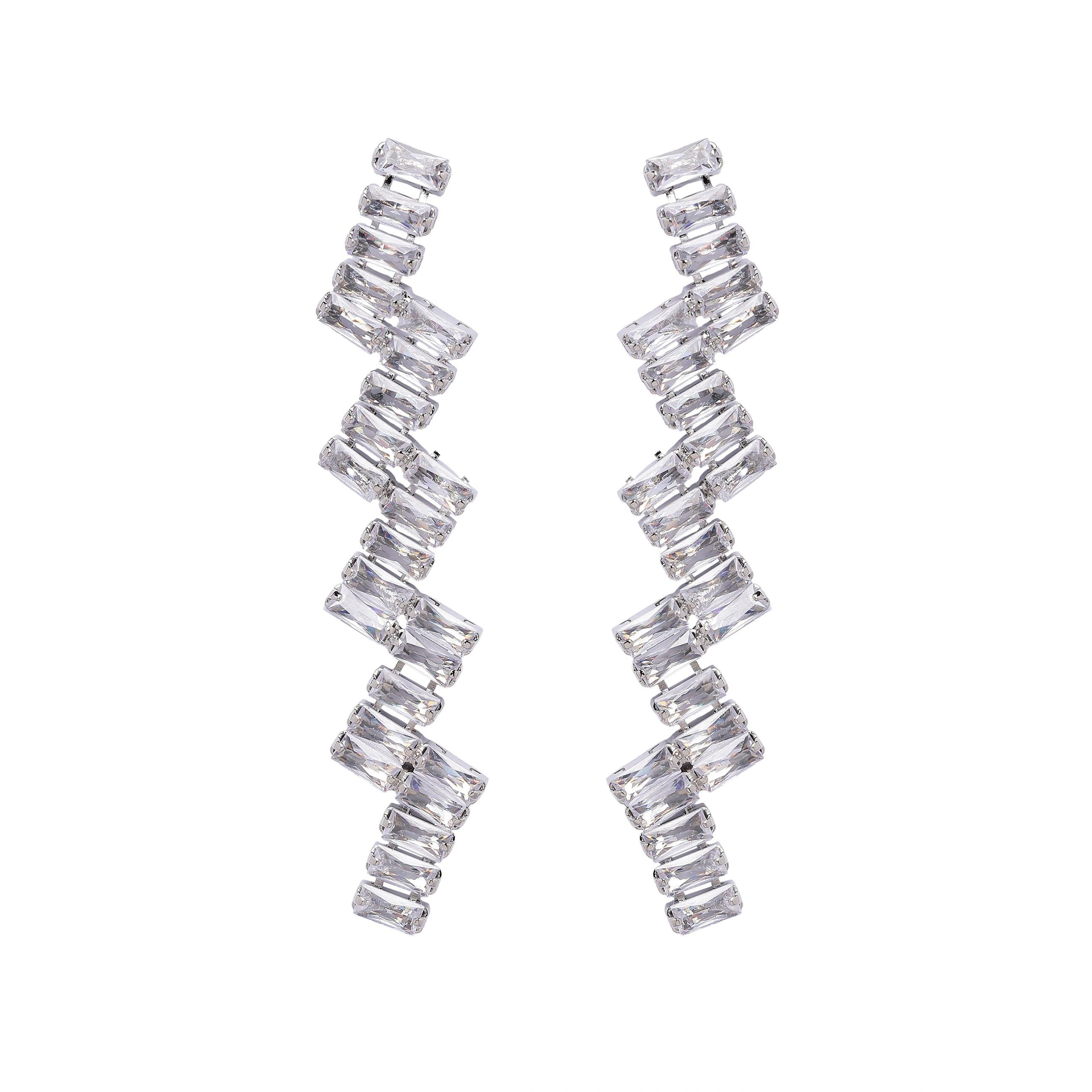 Die versetzte Anordnung der Steine verleiht den Ohrringen Bewegung und Dynamik und schafft so einen Look, der modern und zeitlos zugleich ist. Das Design reflektiert das Licht aus jedem Winkel und zieht mit seinem schimmernden Glanz alle Blicke auf sich. Diese Ohrringe sind ein echtes Statement-Piece, das Raffinesse und Charme ausstrahlt und jedem Outfit einen Hauch von Glamour und Eleganz verleiht. Ob für einen besonderen Anlass oder um einen lässigen Look aufzuwerten – diese Ohrringe werden Sie begeistern. Größe: 1,1 cm x 6,1 cm | Beschichtung: Rhodiumplattiert | Verschluss: Stecker und Rückseite