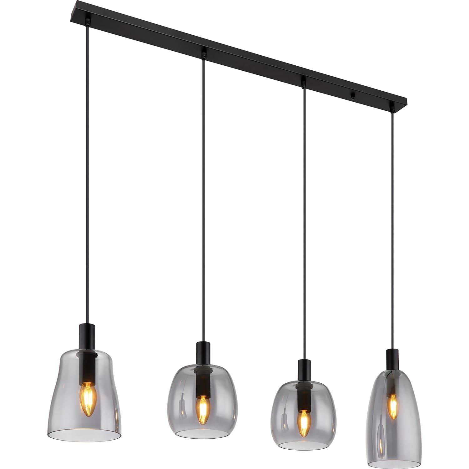 Hängeleuchte Metall schwarz matt, Glas rauchfarben, Kabel PVC schwarz, Höhe kürzbar (Hängeleuchte), 3 unterschiedliche Gläser, LxBxH: 1070x160x1200mm, exkl. 4x E14 40W 230V.