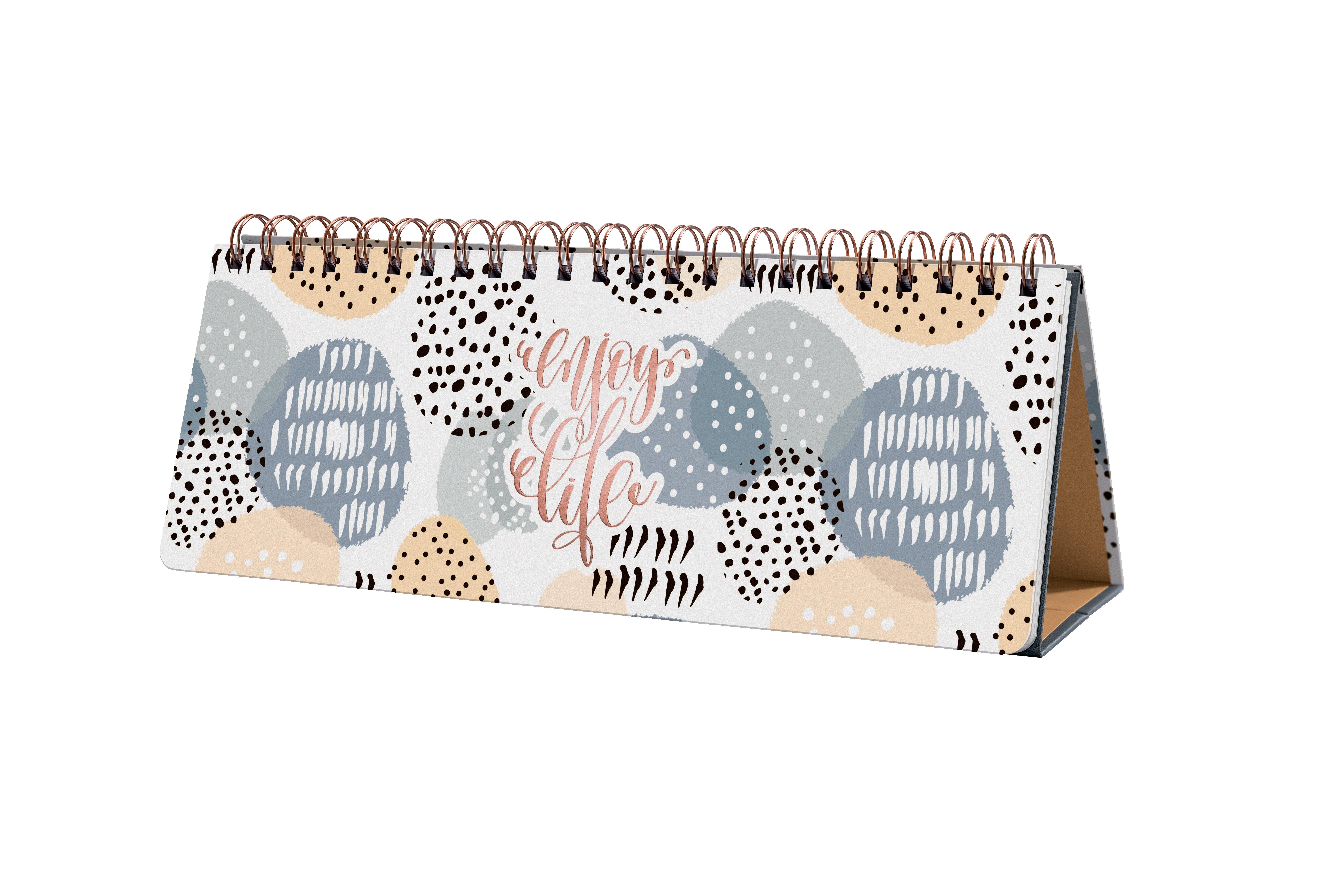 Ihre Produktvorteile: • Trendiges Coverdesign mit hochwertigem Motivdruck und glänzender Folienveredelung • Sehr langlebig durch robustes Cover und hochwertige Metallic-Ringbindung • Weißes Papier (FSC-zertifiziert), bedruckt in edlem Grau • Kalendarium/Planungsseiten zum Selbsteintragen der Daten, To-do-Listen, Platz für Notizen (in Dot-Lineatur) • Mit Aufstellfunktion und 2 exklusiven gratis Stickerbögen zum individuellen Gestalten der Einträge