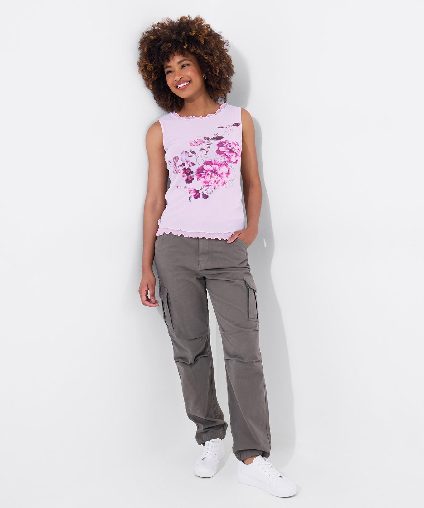 Dieses mehrlagige Mesh-Top präsentiert ein lebhaftes Blumenmuster und bietet eine stilvolle und bequeme Option für verschiedene Anlässe. Das Design umfasst zarte Rüschendetails am Ausschnitt und Saum, die dem Stück einen femininen Touch verleihen.