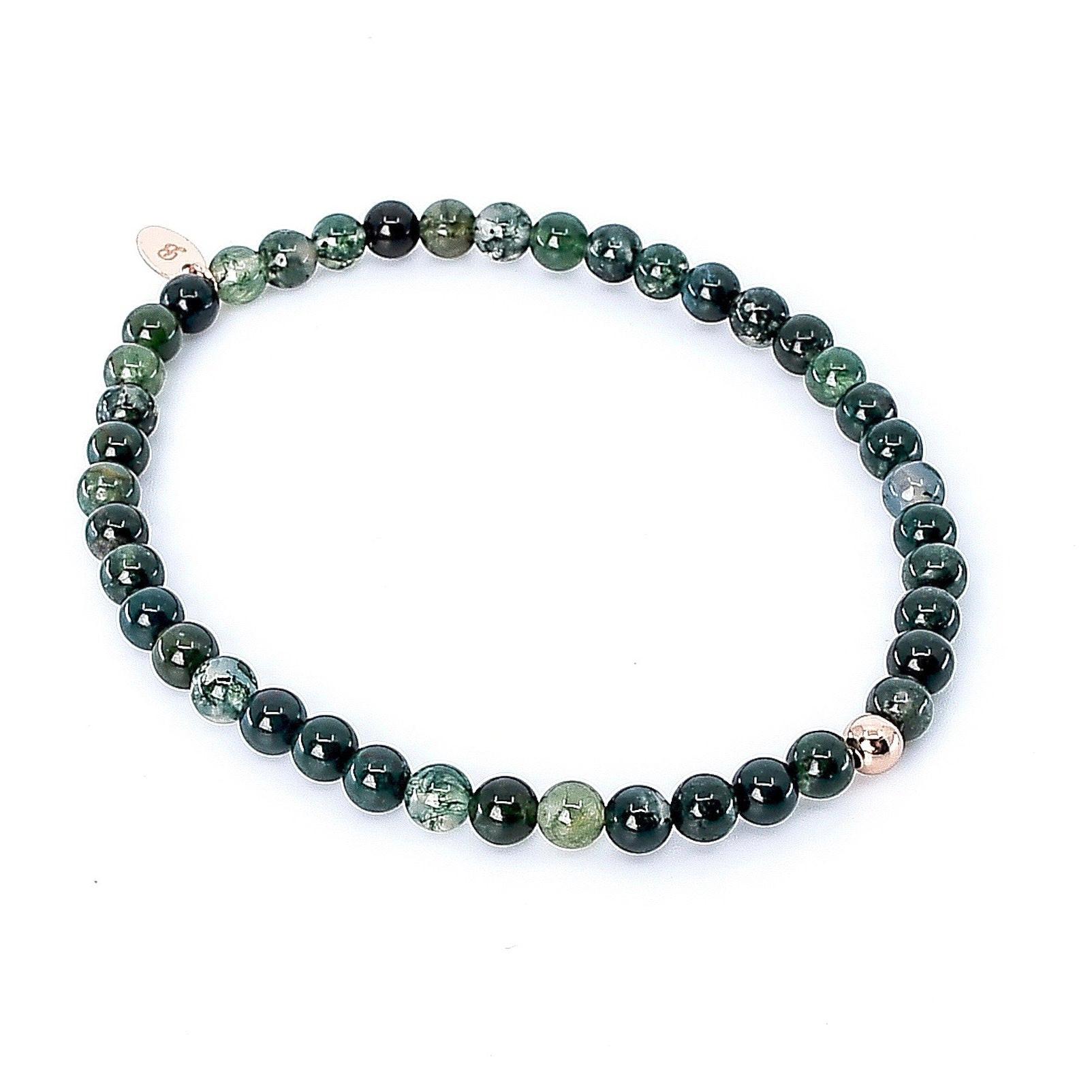 Dieses Damen Armband vereint die edlen Steine Moosachat und Achat, die in harmonischen Grüntönen und Erdfarben erstrahlen. Die rosé vergoldete Silberperle ergänzt das Design und verleiht dem Armband eine elegante, moderne Note. Die Farben des Armbands spiegeln die natürliche Schönheit der Erde wider und bieten eine perfekte Verbindung von Natur und edlem Schmuck.