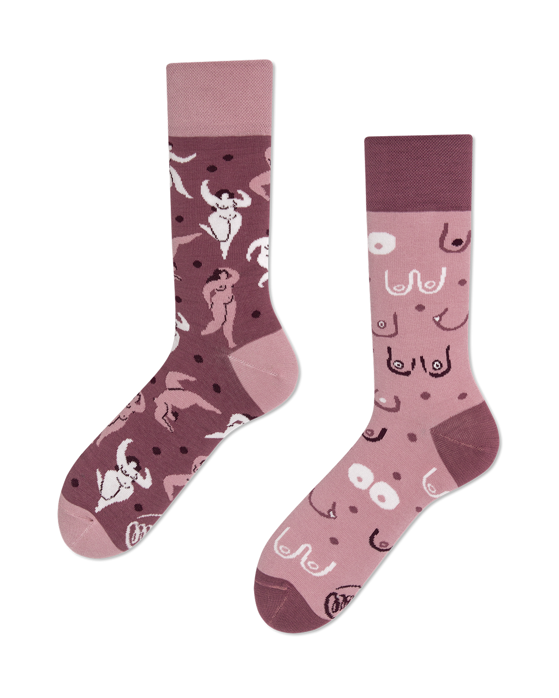 Diese Socken präsentieren ein verspieltes und künstlerisches Design, das die weibliche Form zelebriert. Eine Socke zeigt verschiedene Darstellungen von Brüsten, während die andere stilisierte Figuren darstellt, wodurch ein einzigartiges und ausdrucksstarkes Paar entsteht.