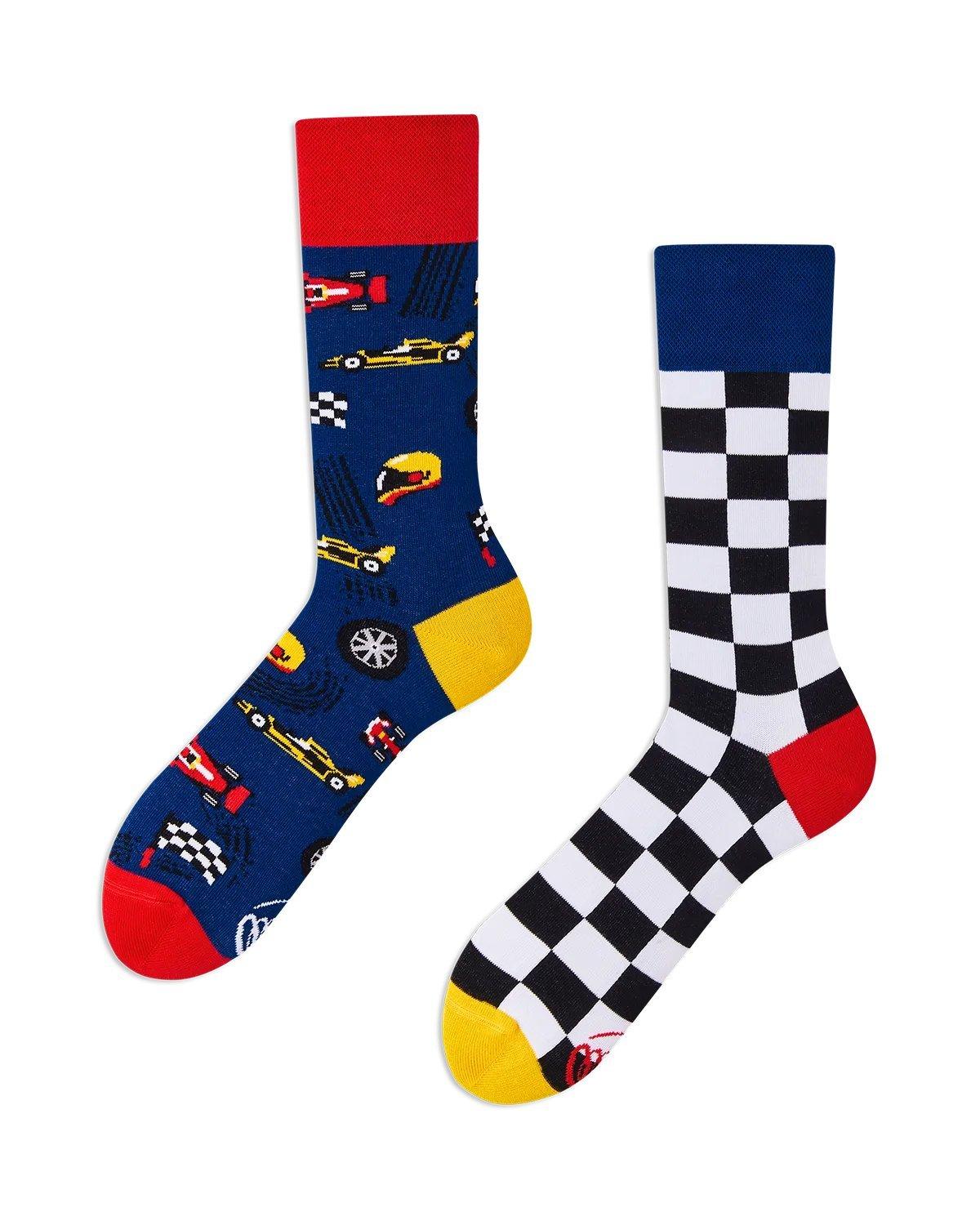Diese Formula Racing Socken zeichnen sich durch ein verspieltes und dynamisches Design aus, perfekt, um jedem Outfit einen Hauch von Spass zu verleihen. Eine Socke zeigt einen leuchtend blauen Hintergrund, verziert mit verschiedenen Rennwagen, Helmen und Zielflaggen, die die Spannung der Rennstrecke einfangen. Die andere Socke ergänzt dieses Thema mit einem klassischen schwarz-weissen Schachbrettmuster, das an eine Zielflagge erinnert.