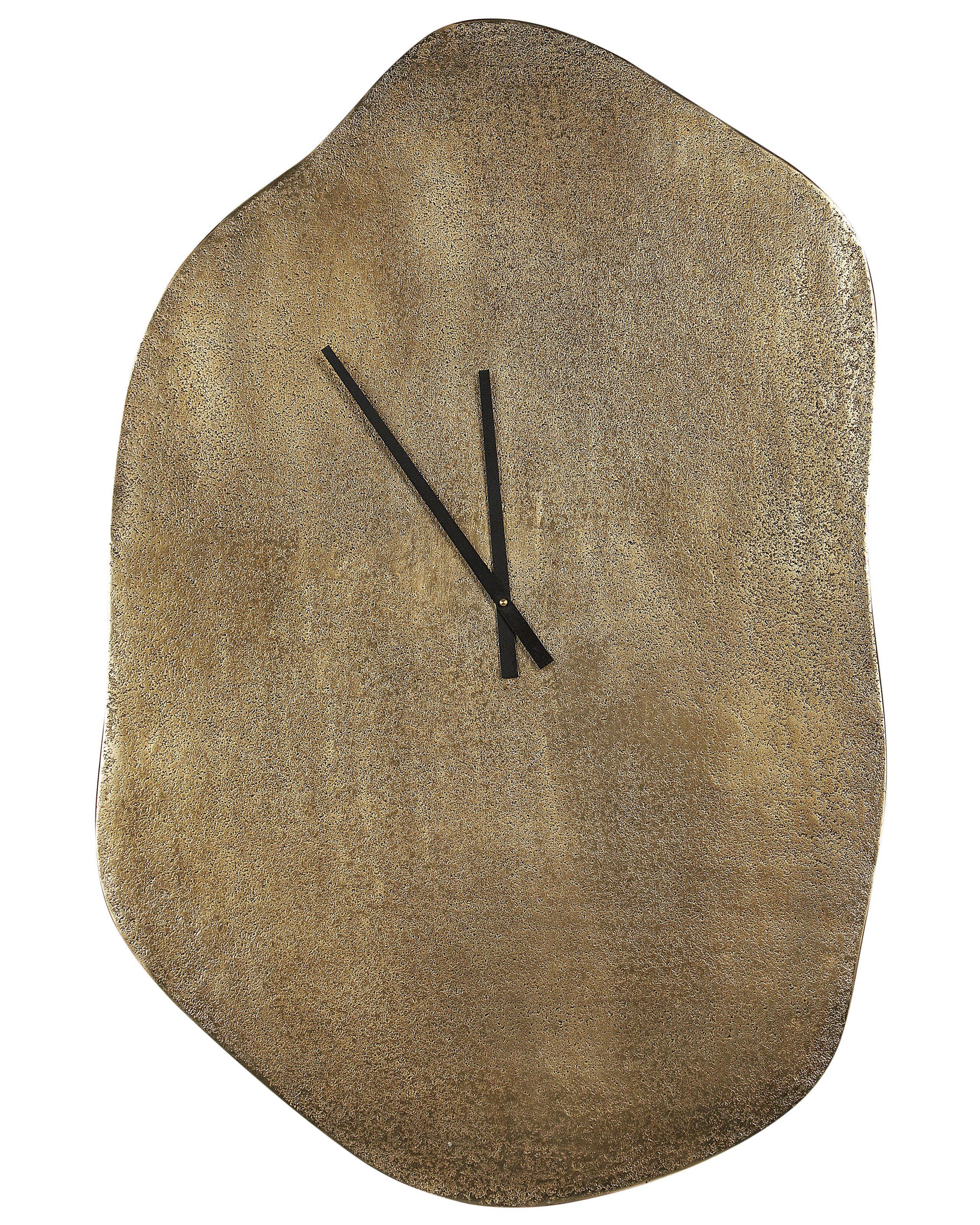 Wanduhr in asymmetrischer Form. Diese moderne Wanduhr besticht durch ihr minimalistisches Design in Messing und dezenten schwarzen Zeigern. Ihr schlichter und eleganter Look macht sie zu einem vielseitigen Wohnaccessoire, das verschiedene Einrichtungsstile stilvoll ergänzt. Diese Uhr ist perfekt geeignet, um jedem Raum einen Hauch von Eleganz zu verleihen und verbindet Funktionalität mit moderner Ästhetik.