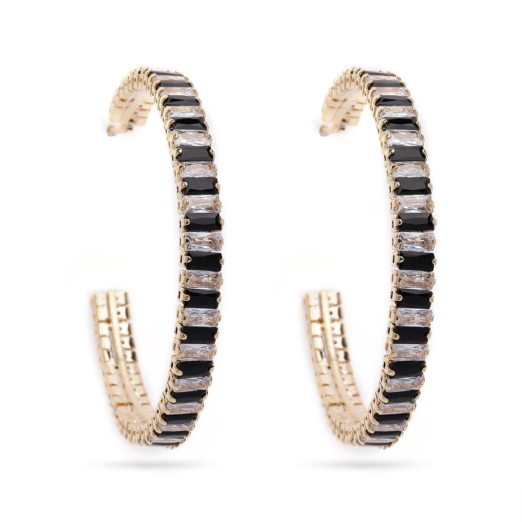 Verleihen Sie Ihrem Outfit mit diesen eleganten goldenen Creolen mit schwarzen und kristallklaren Akzenten das gewisse Etwas. Das einzigartige, geschwungene Design, verziert mit abwechselnd schwarzen und funkelnden Kristallsteinen, interpretiert einen klassischen Stil modern. Diese Ohrringe sind perfekt, um jedem Outfit einen Hauch von Raffinesse zu verleihen und ziehen garantiert alle Blicke auf sich. Größe: 0,4 cm x 4,2 cm | Beschichtung: Vergoldet | Verschluss: Stecker und Rückseite