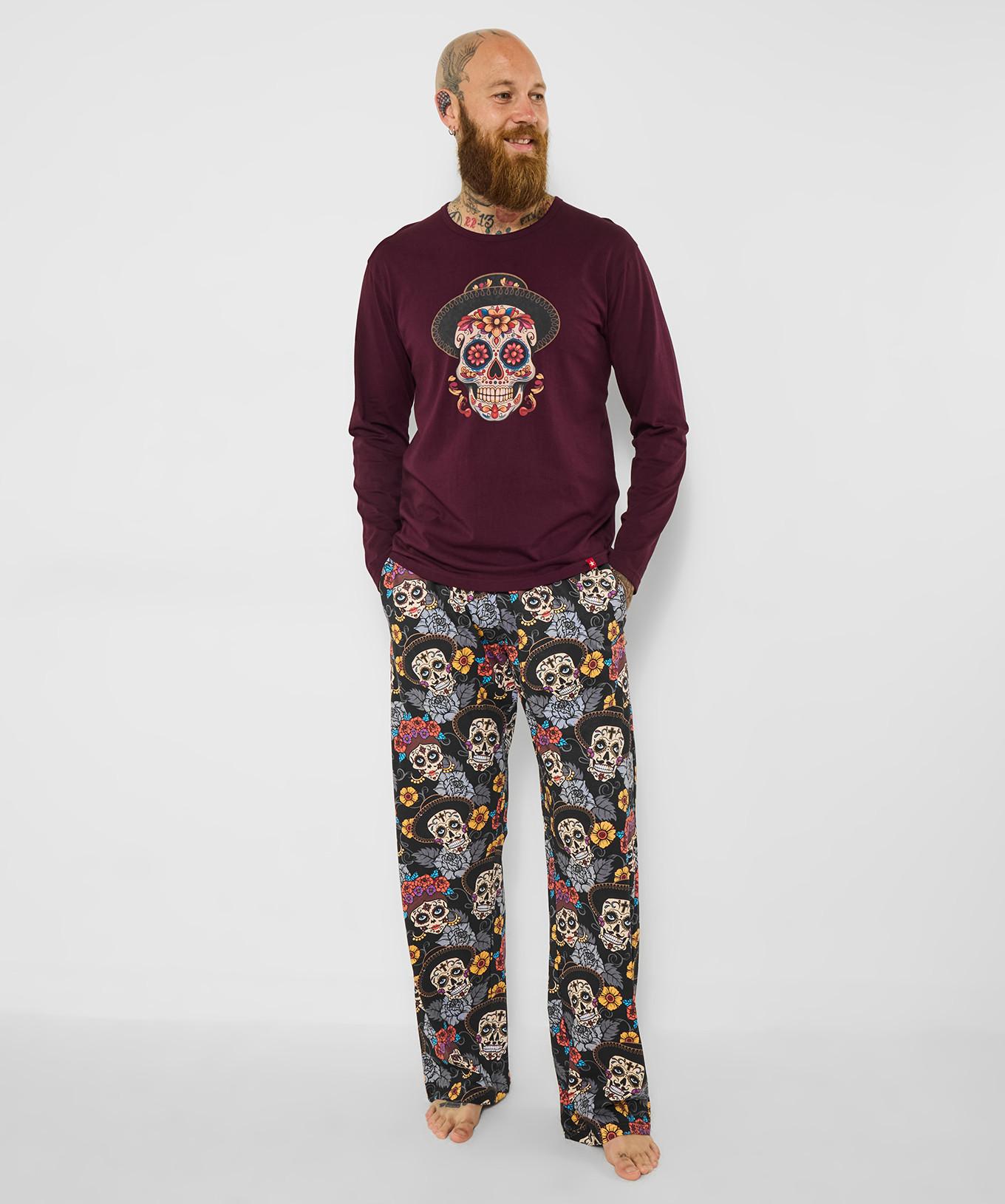 Dieses Pyjama-Set besteht aus einem langärmeligen Oberteil und passenden Hosen, ideal für gemütliches Entspannen. Das Oberteil hat einen grossen, farbenfrohen Totenkopf-Print auf der Vorderseite, während die Hose mit einem durchgehenden Totenkopf- und Blumenmuster verziert ist.
