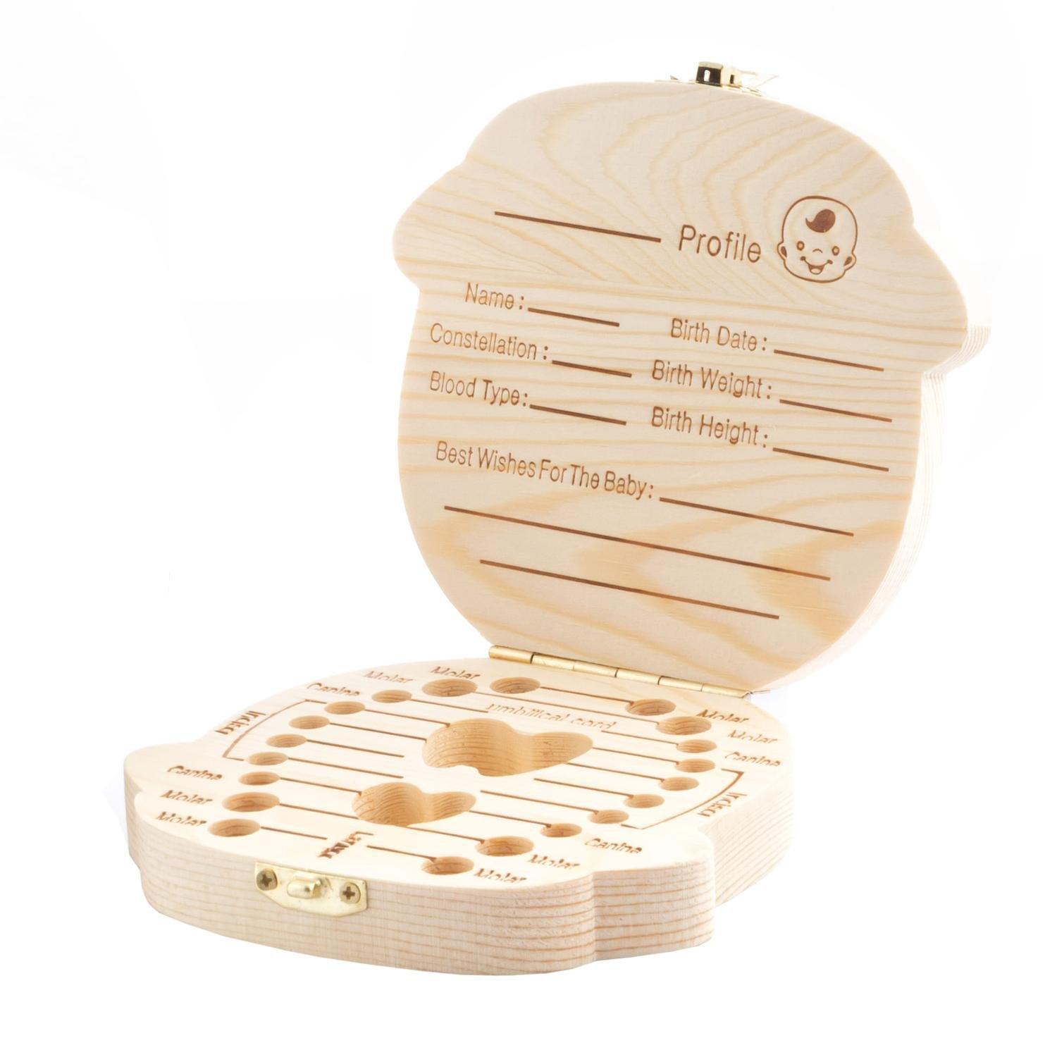 Süße Zahnbox für Kinder. In dieser Zahnbox können Sie die Milchzähne Ihres Kindes für zukünftige Erinnerungen aufbewahren. Das Innere der Zahnbox bietet Platz für die Milchzähne des Babys, wobei einzelne Fächer die Namen für jeden Zahn tragen. Das Getriebe bietet auch Platz für die Nabelschnur. Auf der Innenseite des Deckels ist Platz, um einige Informationen über das Kind aufzuschreiben, wie zum Beispiel Namen, Sternzeichen, Geburtsdatum und Wünsche für das Kind. Die Zahnbox wird mit einem kleinen Metallschloss verschlossen und ist ein schönes Geschenk für Ihr Kind oder für jemanden mit einem Neugeborenen.