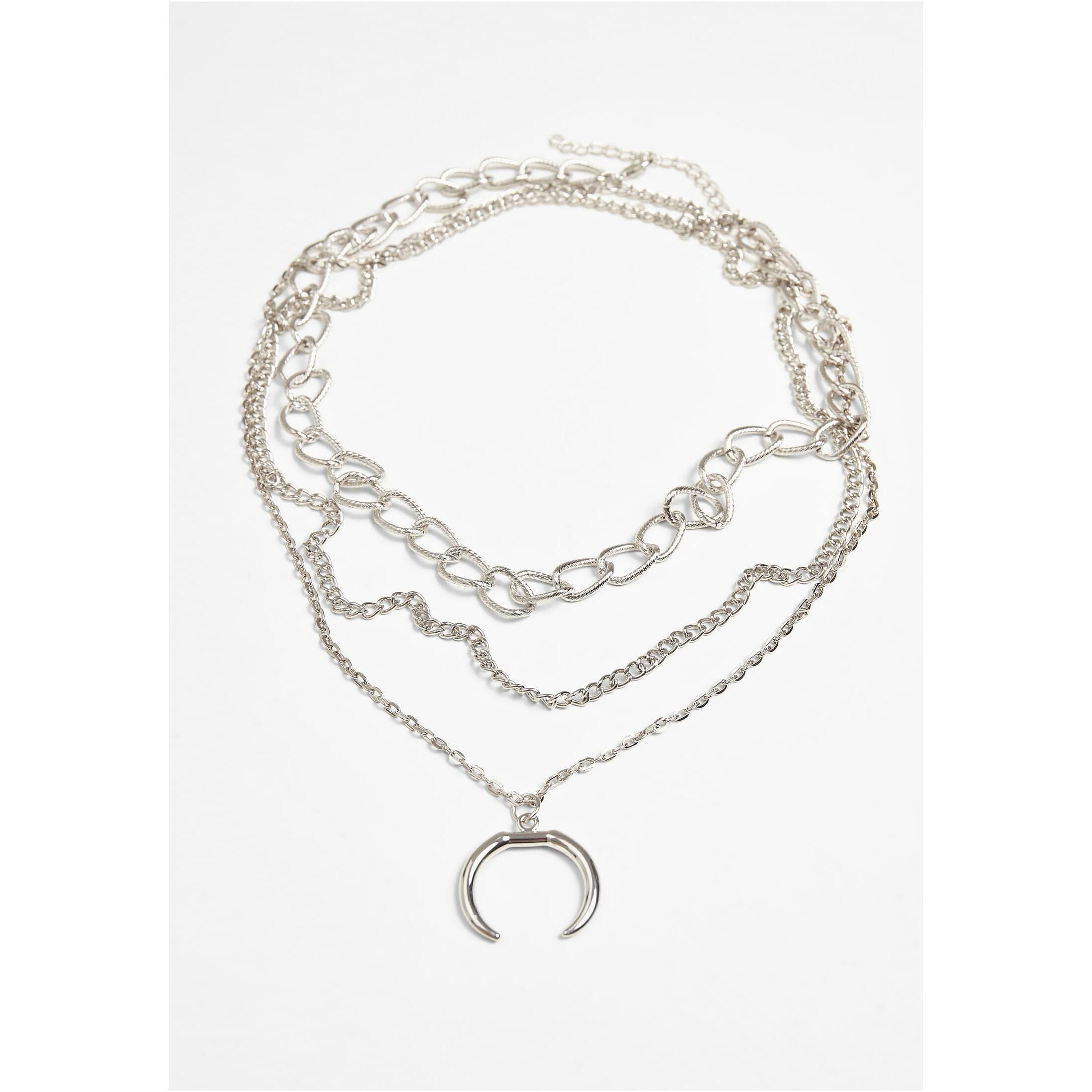 Die Halskette besteht aus drei Reihen von Gliedern unterschiedlicher Form und Größe, die auf Dorn- und Ankerketten ruhen. Die Schmuckkette liegt in mittlerer Höhe am Hals auf und die mittlere Kette ist mit einem halbmondförmigen Anhänger verziert. Die Kette ist 48 cm lang und hat eine zusätzliche 7 cm lange Verlängerungskette für eine individuelle Größenanpassung. Sie besteht aus Eisen und einer Zinklegierung.Zubehör 2: 90% Eisen 10% Zinklegierung,gsm