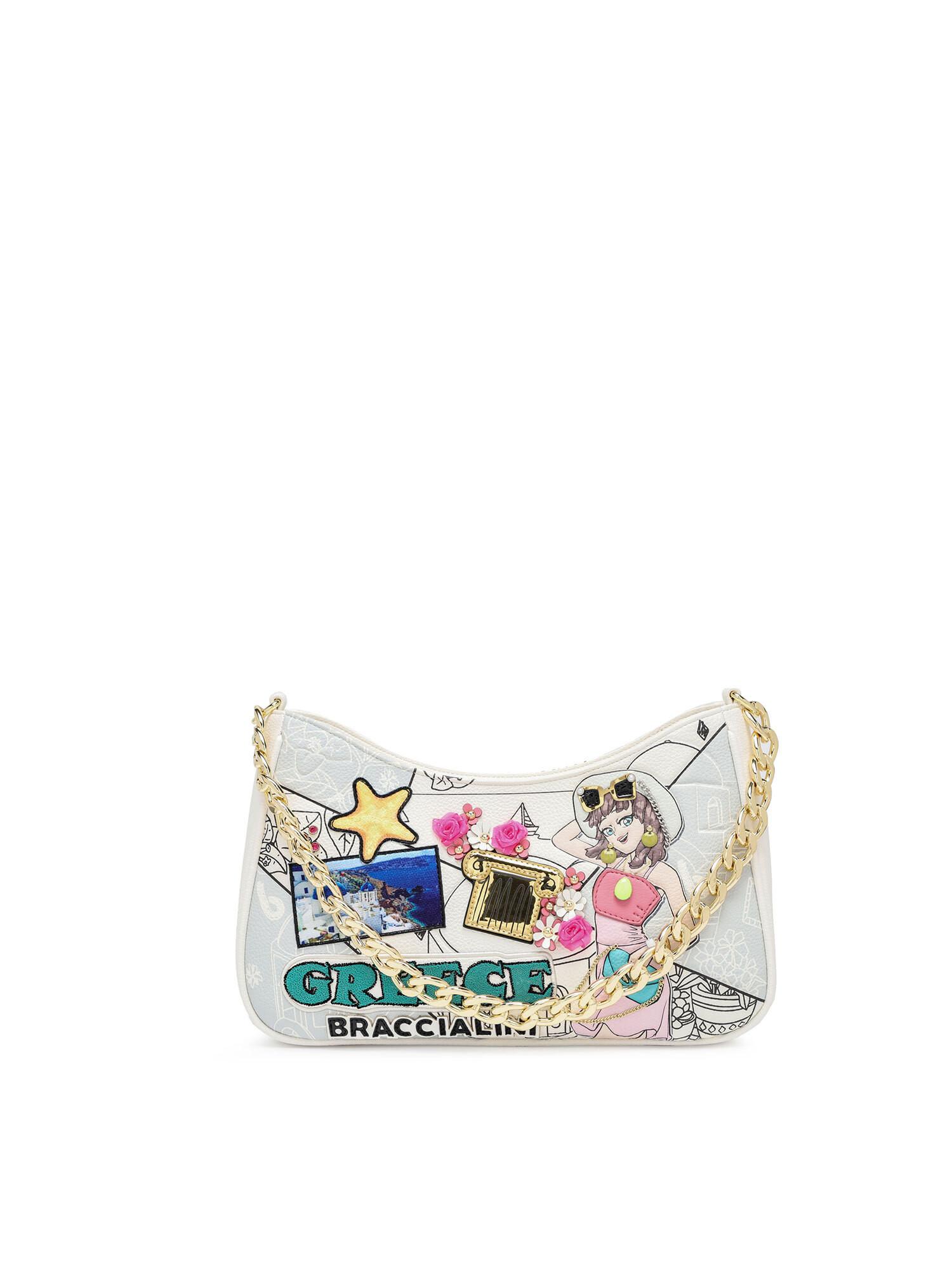 Diese Damen-Umhängetasche präsentiert ein einzigartiges Design mit einem "Griechenland"-Thema, verziert mit verschiedenen Illustrationen und Texten. Sie ist mit einem stilvollen goldfarbenen Kettenhenkel und einem Schultergurt aus Öko-Leder ausgestattet, was ihrem verspielten Erscheinungsbild einen eleganten Touch verleiht. Die Tasche ist als modisches Accessoire für verschiedene Anlässe konzipiert.