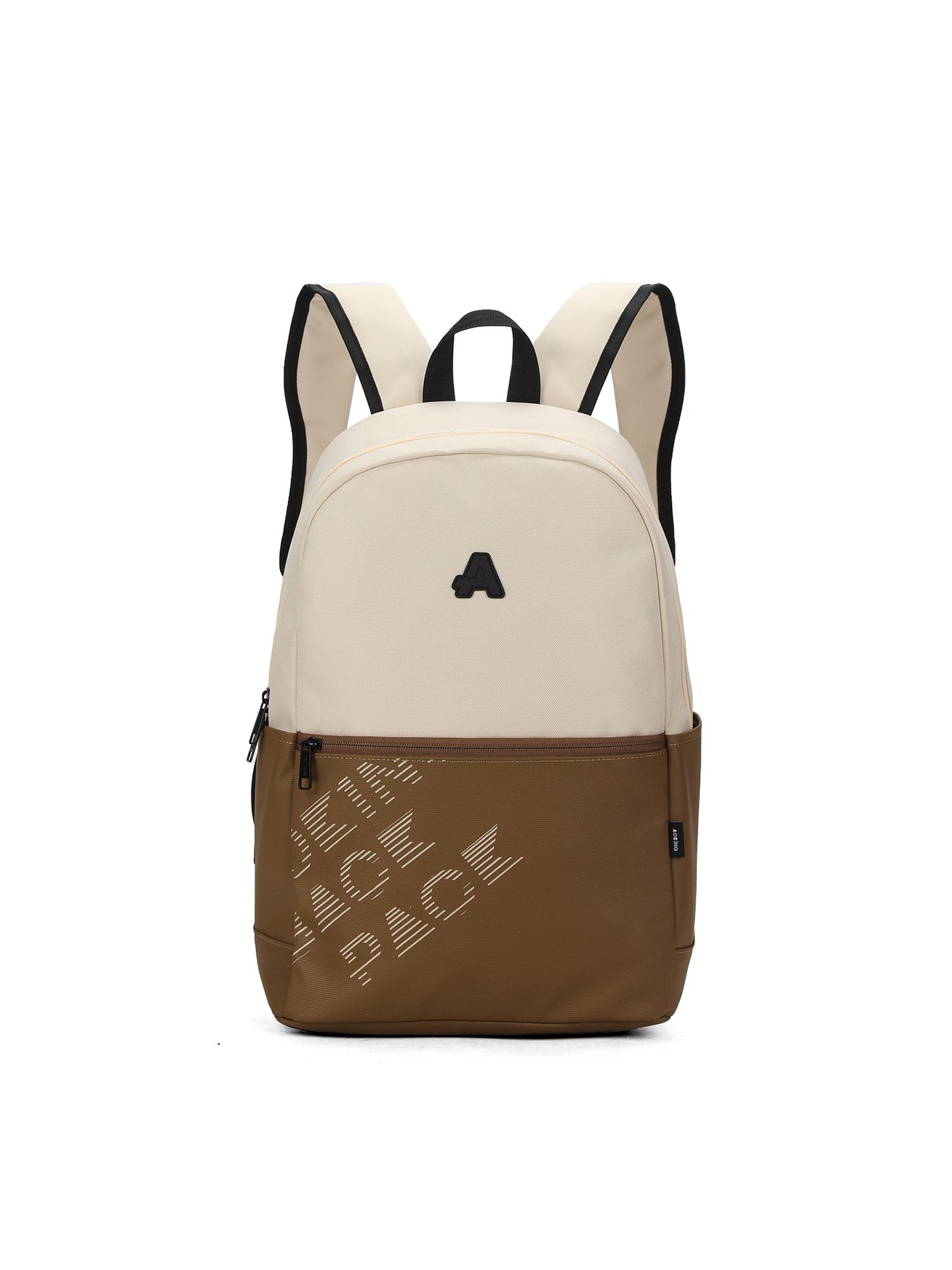 Dieser zweifarbige Rucksack bietet eine stilvolle und praktische Lösung für den Transport alltäglicher Gegenstände. Das Design zeichnet sich durch einen kontrastierenden Farbblock aus, mit einem helleren Farbton im oberen Bereich und einem dunkleren Farbton im unteren Bereich, was eine moderne Ästhetik schafft. Ein dezentes Logo ist auf der Vorderseite platziert und verleiht dem Design einen Hauch von Markenidentität, ohne es zu überladen.
