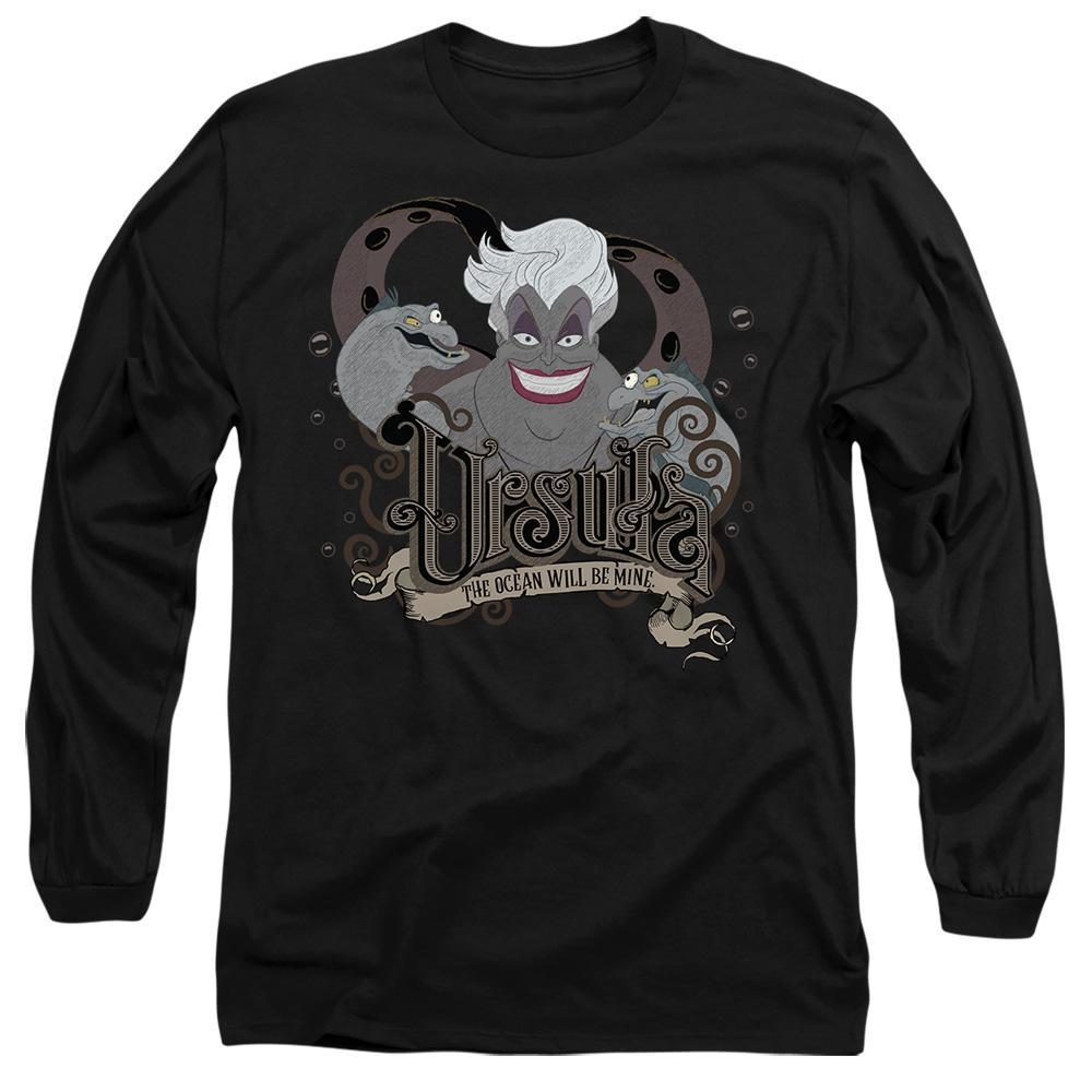 Dieses Langarm-T-Shirt zeigt einen auffälligen Grafikdruck von Ursula aus Disneys Arielle die Meerjungfrau, begleitet von ihren Aalen Flotsam und Jetsam. Das Design enthält den Satz „The Ocean Will Be Mine“ in einem verzierten Banner, das den Ehrgeiz der ikonischen Bösewichtin einfängt. Dieses T-Shirt ist eine bequeme und stilvolle Möglichkeit, die Liebe zu klassischen Zeichentrickmärchen zu zeigen.