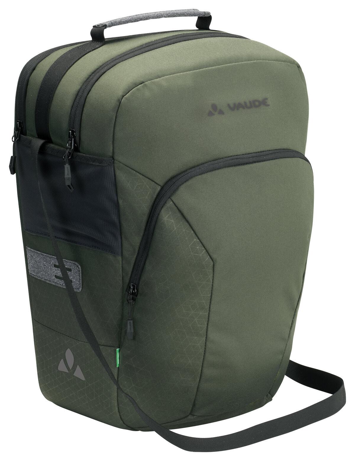 Die eBack Gepäckträger Fahrradtasche richtet sich speziell an Pendlerinnen oder Tourerinnen, die mit Laptop (bis 15,6") unterwegs sind und das Gerät sicher gepolstert verwahrt wissen wollen. Dabei spielt es keine Rolle, ob sie mit E- oder Bio-Antrieb unterwegs sind. Im großen Hauptfach kann ein zweiter Akku (bis 40 cm) oder eine Trinkflasche befestigt werden. Dazu findet alles Platz, was man unterwegs oder für die Arbeit benötigt - Unterlagen, Snackbox, Wechselwäsche. Ein Netzfach ordnet Ladekabel und andere Kleingegenstände. Dazu bietet die Fronttasche mit großem Eingriff viele Möglichkeiten zur Organisation. Die Gepäckträgertasche wird mit dem QMR 2.0-System stabil rechts oder links am Gepäckträger befestigt. Die Haken sind über einfach bedienbare Handrädchen justierbar. Mit einem kleinen Bügelschloss (z. B. Abus 145/20) kann die Radtasche direkt am QMR-Haken verriegelt werden. Die Gepäckträgertasche ist dank der ausgesteiften Seitenteile selbststehend. Lieferumfang: 1 Tasche, die entweder links oder rechts am Gepäckträger befestigt werden kann. Ein abnehmbarer Schultergurt, reflektierende Elemente und eine Regenhülle runden die umfangreiche Ausstattung ab. Die Gepäckträgertasche ist mit Eco Finish umweltfreundlich wasserabweisend ohne Fluorcarbone (PFC) ausgerüstet. Das VAUDE Green Shape-Label steht für ein umweltfreundliches, funktionelles Produkt aus nachhaltigen Materialien.