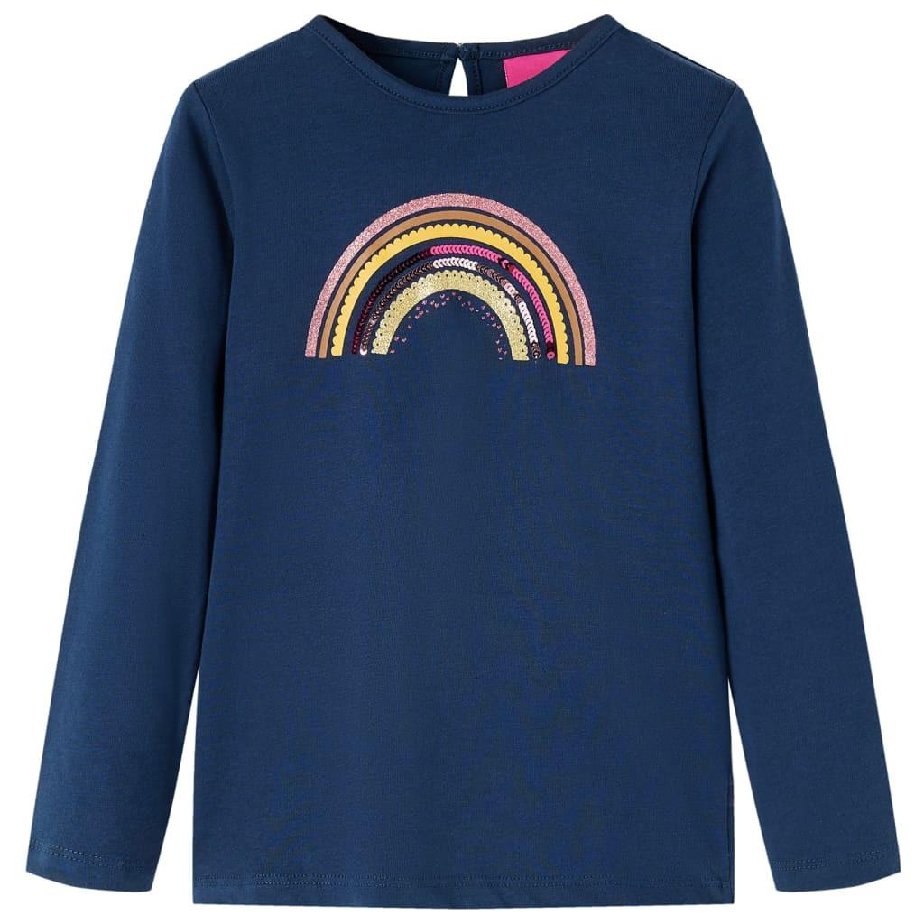 Dieses Kinder-T-Shirt hat lange Ärmel, einen Rundhalsausschnitt und einen Schlüssellochverschluss mit Knopf an der Rückseite. Dieses T-Shirt in Marineblau ist mit einem schönen Regenbogen bedruckt. Das Langarmshirt ist aus weichem Material gefertigt, das zu 95 % aus Baumwolle und zu 5 % aus Elastan besteht und daher nicht nur äußerst komfortabel, sondern auch atmungsaktiv ist.