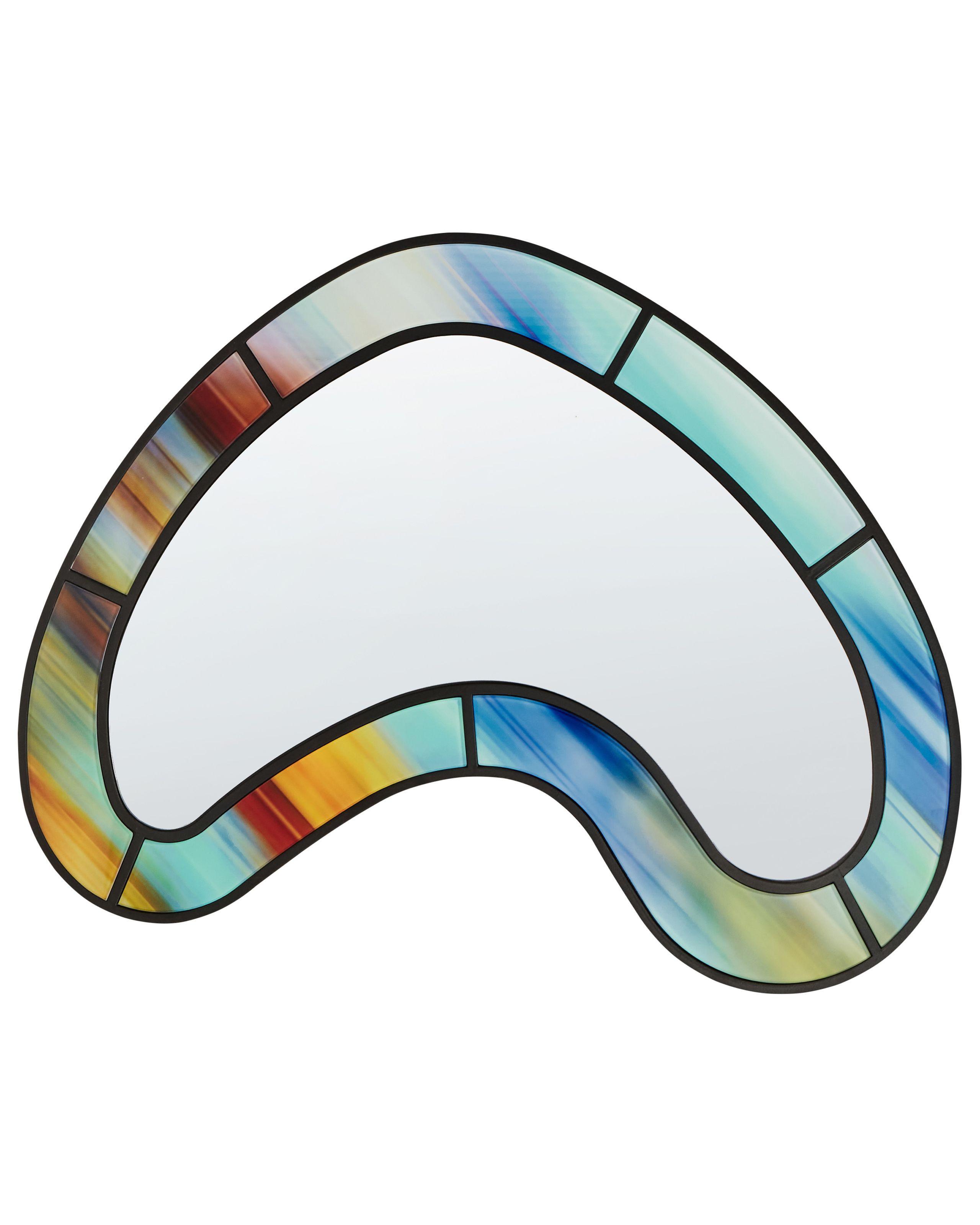 Moderner, asymmterischer Hängespiegel mit breitem Rahmen. Wer seine Wände aufpeppen und dabei auch einen praktischen Begleiter haben möchte, ist mit diesem originellen Dekospiegel gut beraten. Er verfügt über eine robuste MDF-Rückseite mit integrierten Aufhängern. Die mehrfarbigen Details sind mit abgerundeten Kanten versehen und in den schwarzen MDF-Rahmen eingesetzt. Dank des bunten Farbverlaufs verzaubert der Spiegel mit einer unvergleichlichen Retro-Optik, die ihn auf Ihrer Wand sicherlich auffallen lässt.