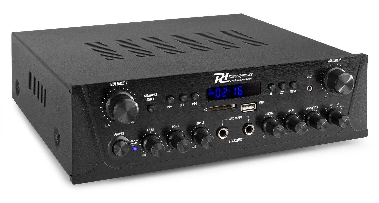 Audiokanäle: 22-Kanal-Verstärkersystem mit 2x 100 WMP3-Player mit USB-Anschluss / SD-KartenleserFM-Radio-Tuner mit digitalem LCD-DisplayBluetooth für Audio-StreamingMikrofoneingang 6.3 mm Klinke & Stereo Line In- und Output (Cinch)Die 2 Zonen sind individuell einstellbarLieferumfang:Verstärker PV220BTNetzkabelFernbedienung
