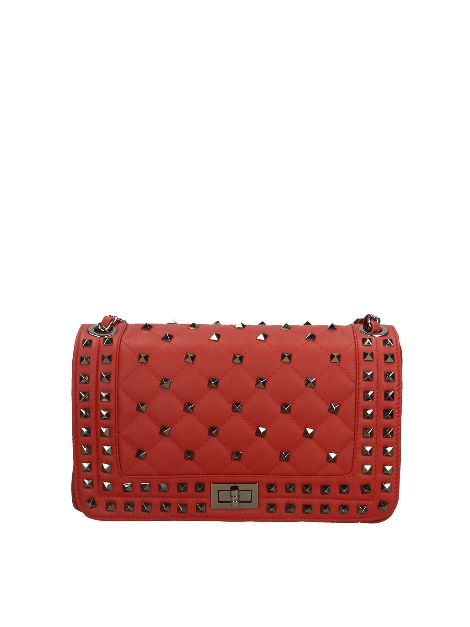 Diese Damen-Umhängetasche verfügt über ein Einzelfach und einen Kettenschulterriemen aus gewebtem Leder. Es ist ein italienisches handgefertigtes Produkt aus echtem gestepptem Sauvage-Leder mit Pyramidennieten.
